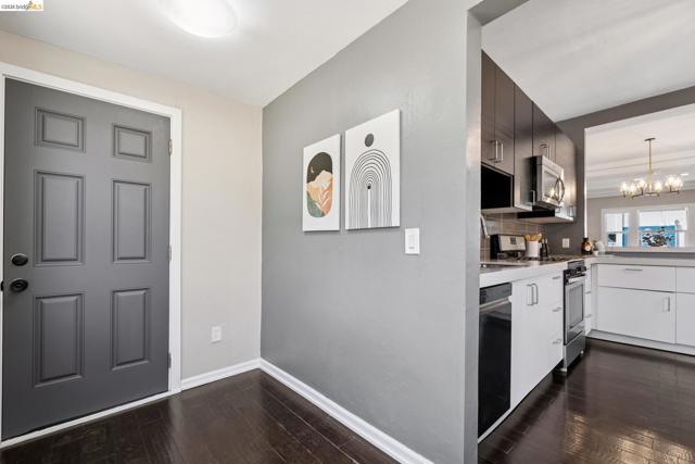 Berkeley Bungalow w/ Modern Flow, close to Berkeley Bowl West. Picket fence says “modern Craftsman-style,” - Layout & upgrades say “contemporary East Bay living.” Located in highly walkable/bikeable W. Berkeley, this 2-bed, 2-bath bungalow combines timeless character w/ thoughtful updates designed for today’s lifestyle. Remodeled inside & out, the home invites you up a landscaped path to a brick porch. Open-concept living, dining, & kitchen area flows seamlessly to private, low-maintenance yard w/ flexible sitting area for relaxing or secure parking pad. Office nook for additional work space off kitchen. Remodeled kitchen features SS appliances, gas range, dishwasher, breakfast bar & stacked washer/dryer. 2 well-sized bedrooms include true primary suite w/ generous closet & updated en-suite bath w/ walk-in shower. 2nd full guest bath w/ modern finishes & floating shelves. Interior details w/ engineered wood flooring throughout, dual-pane windows w/ coverings, trayed ceilings, & stylish designer lighting. Long shared driveway leads to private parking pad behind wide gate for vehiclular access. Walk & Bike Score of 93. Steps from neighborhood faves like Caffe Chiave, Anchalee Thai, Tipsy Yeti. 10-min bike ride to Ashby BART or UC Berkeley or B.Bowl West. BESO Energy Score = 4