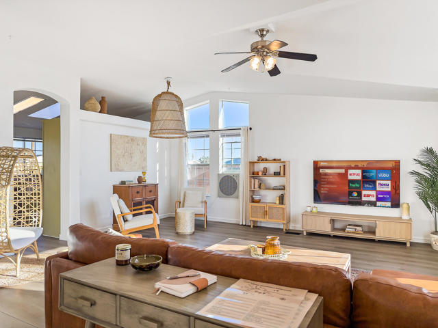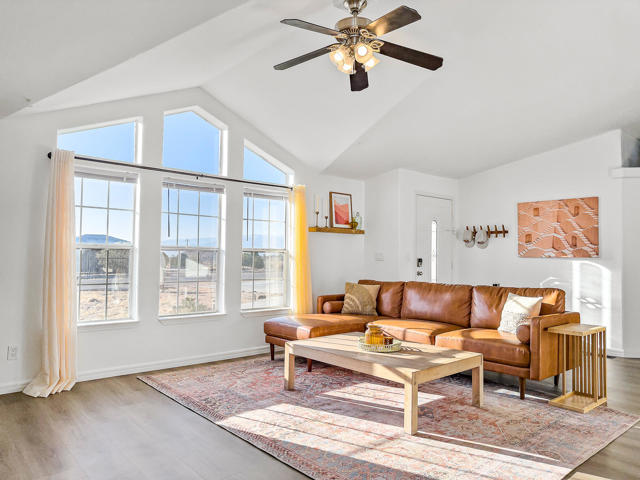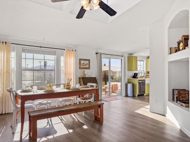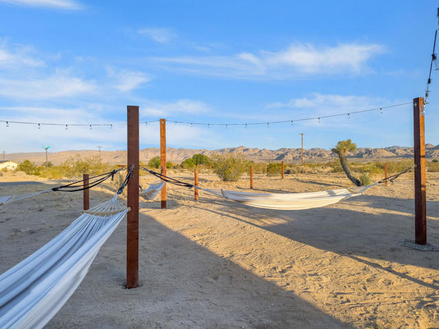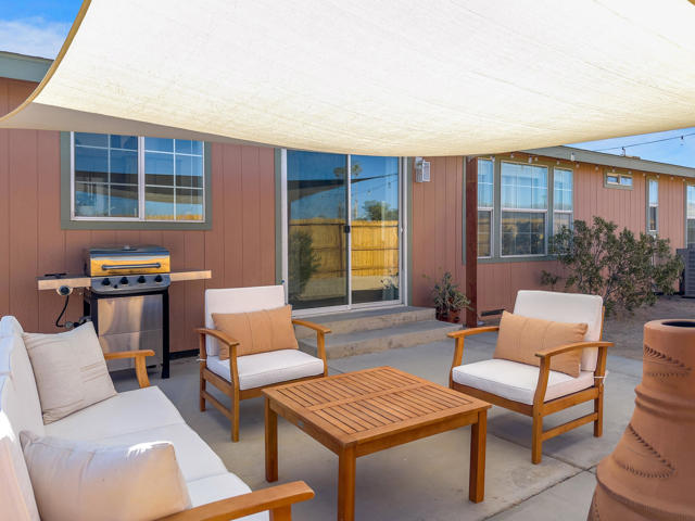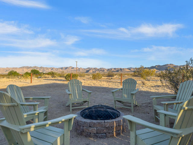 Joshua Tree 3-bedroom desert retreat in the Sunfair area just minutes from Joshua Tree National Park, offering expansive views, outdoor living, and unforgettable stargazing nights. Welcome to Leaning Joshua, a spacious high-desert retreat set beneath the wide open skies of one of Joshua Tree's most desirable neighborhoods. Inside, the home features an inviting open living area, a dining space ideal for gathering, and a fully equipped kitchen with modern appliances. Three comfortable bedrooms provide flexible accommodations for family, guests, or potential rental use. Step outside to experience the beauty of the surrounding desert landscape. The backyard is designed for outdoor living with a shaded seating area, chimenea, fire pit, BBQ grill, and multiple lounge spaces ideal for enjoying breathtaking sunsets and peaceful desert evenings. A custom deck with lounge chairs offers the perfect place to relax in the sun, while the cowboy tub provides a refreshing way to cool off while taking in the vast desert sky. Thoughtfully oriented for stargazing, the deck offers a front-row seat to Joshua Tree's remarkable night skies, including stunning views of the Milky Way and the moon rising along the eastern horizon as it travels across the desert sky. Surrounded by open desert landscape and minimal light pollution, the property offers exceptional privacy and some of the most spectacular stargazing skies the high desert is known for. Conveniently located near Joshua Tree Village, local shops, dining, and the entrance to Joshua Tree National Park, this property presents an excellent opportunity as a full-time residence, weekend getaway, or investment property in one of the high desert's most sought-after destinations.