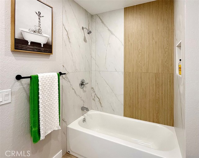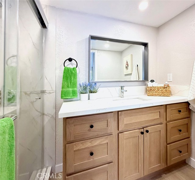 Welcome to this wonderful remodeled end unit townhome in South Coast Metro area. The gorgeous high beam ceiling and sky lights in the living room along with the open concept floor plan create a relaxing environment. The home showcases fully redesigned and remodeled kitchen with white oak cabinets, breakfast bar, and new stainless steel appliances. All new paint and wood plank luxury vinyl flooring throughout the house and tile in kitchen and bathrooms. The dining area is enhanced with new ceiling lighting, creating a bright and welcoming space for meals and entertaining. The primary suite is conveniently located on the first floor and includes an en-suite bathroom fully updated with designer tile, shower and modern cabinetry. The suite is very spacious has an impressive 10 feet high ceiling with beautiful installed slat panel wall, a walk-in closet and a private outdoor patio with a secured gate. Upstairs, the second and third bedrooms share a bathroom that has been completely remodeled with designer tile, new cabinetry and bathtub. Residents also enjoy lush green areas and access to a community pool and spa just a short walk away. Ideally located, this home is just minutes from restaurants and shops, South Coast Plaza, Segerstrom Center for the Arts, 405 and 55 fwys, UCI, John Wayne Airport, Newport and Huntington Beach. Welcome home!