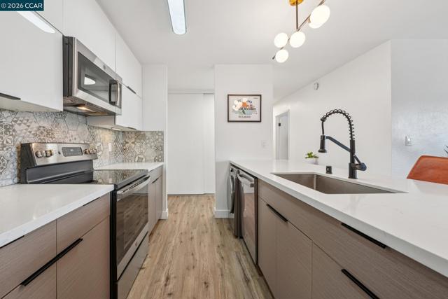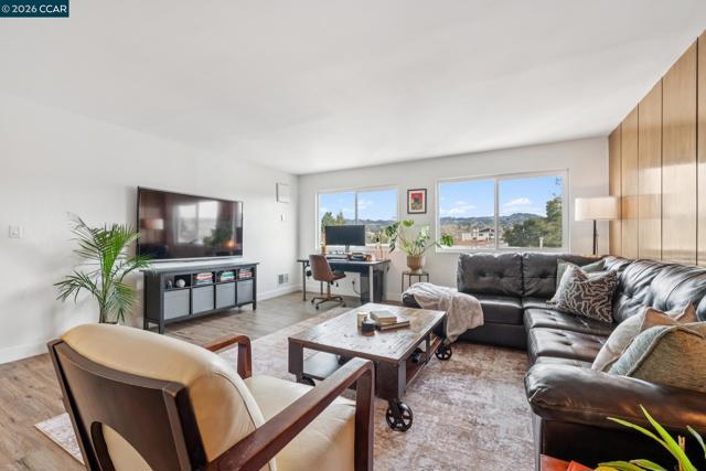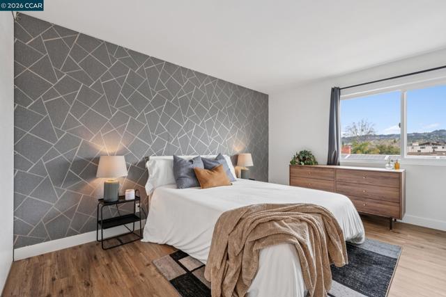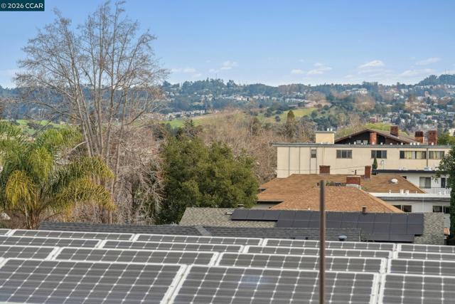 Elevate your lifestyle in this stunning top-floor retreat where authentic Mid-Century character meets a thoughtful recent update. Ideally situated in the heart of Adams Point, this private sanctuary offers the rare luxury of no neighbors above and just one shared wall, creating a peaceful, light-filled escape framed by expansive windows and sweeping hill and neighborhood views. The open-concept living space is anchored by a striking floor-to-ceiling, wood-paneled feature wall that honors the building’s architectural heritage. The chef’s kitchen is a modern showpiece, featuring intricate geometric tile, European-style cabinetry, and sleek quartz countertops—designed for both everyday living and effortless entertaining. The elevated design continues in both bedrooms with custom textured and geometric wallpaper accents, evoking a refined, boutique-hotel feel. A truly coveted highlight is the rare in-unit laundry, offering unmatched convenience, along with secure garage parking and elevator access—all set within one of Oakland’s most walkable and vibrant neighborhoods.