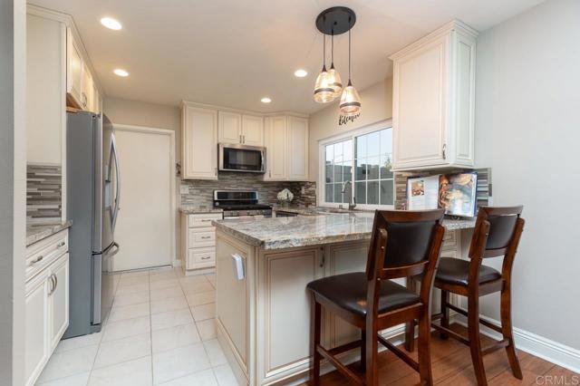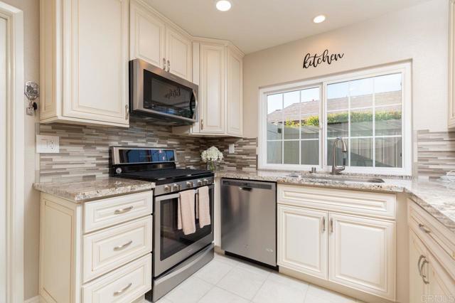 This beautifully remodeled three-bedroom, two-bath single-level home is truly move-in ready, with thoughtful upgrades throughout the interior and exterior. The meticulous owner has spared no detail, creating a home that blends modern comfort with timeless style. Upon entry, you’re welcomed by abundant natural light, warm wood-laminate flooring, and a brand-new front door with security screen. Contemporary finishes and careful attention to detail are evident throughout this turnkey residence. The updated kitchen features granite countertops, modern cabinetry with pull-out storage, stainless steel appliances, recessed lighting, bar seating, and generous counter space—perfect for everyday living and entertaining. The kitchen opens seamlessly to the inviting living area, highlighted by a cozy fireplace with gas starter and sliding glass doors that lead to the beautifully landscaped backyard. Both bathrooms have been fully remodeled with custom tile showers, glass doors, updated vanities, fixtures, and lighting. The guest bath also features a brand-new tub. The spacious primary suite offers a large dressing area, dual sinks, and an oversized mirrored closet, while the two additional bedrooms are filled with natural light. Dual-pane windows with new two-inch wood blinds enhance both comfort and efficiency throughout the home. Outside, the property continues to impress with newer stucco, professionally updated landscaping, and low-maintenance turf complemented by drought-tolerant plants. A full irrigation system with six automatic stations services both the front and backyard. The backyard is thoughtfully designed for relaxing mornings, outdoor entertaining, and peaceful enjoyment under the covered patio. Mature fruit trees including guava, lemon, and tangerine add to the charm. An oversized shed on a permanent foundation—with electrical nearby—offers additional flexibility, while vinyl privacy fencing completes the well-appointed yard. The fully drywalled garage provides ample storage and features a new insulated garage door with automatic opener. The driveway and side walkway have also been newly re-poured. The current formal dining room space was originally designed as a second living area, while the intended dining room is presently used as a home office—offering flexible living options to suit your needs. Additional highlights include owned solar and a roof installed in 2018, providing energy efficiency and long-term value.