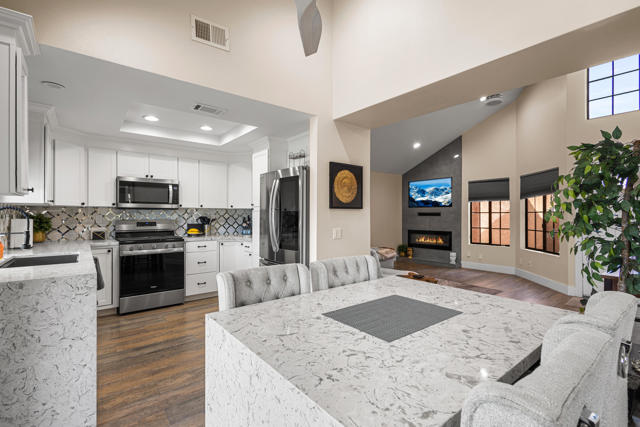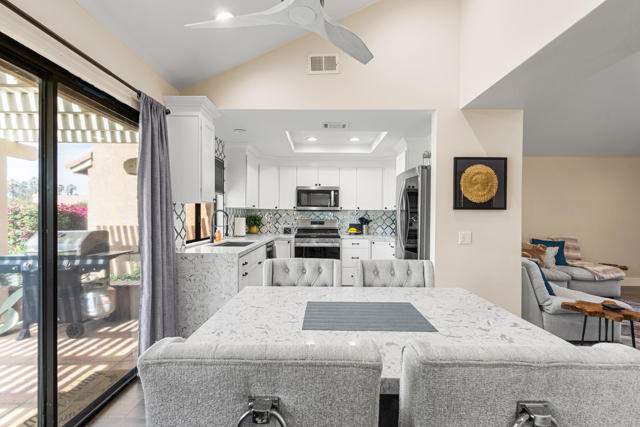 Welcome to refined desert living in the highly desirable Oasis Country Club in Palm Desert. This beautifully upgraded 2 bedroom, 2 bath residence offers the perfect blend of comfort, style, and breathtaking golf course, lake and mountain views. Step inside to soaring ceilings and an open, light filled floor plan designed for effortless living and entertaining. The thoughtfully updated kitchen features quartz countertops, custom cabinetry, ,stainless steel appliances, and designer tile backslash, all perfectly positioned to capture tranquil views of the lush fairways, sparkling lake and majestic mountains. The spacious living area is highlighted by a modern fireplace and dramatic vaulted ceilings, creating a warm yet sophisticated atmosphere. Large sliding doors open seamlessly to the outdoor patio, bringing the beauty of the desert landscape indoors. Enjoy morning coffee or evening sunsets under the expansive pergola covered patio overlooking the golf course and water features, an ideal setting for entertaining or simply relaxing in peaceful surroundings. Located within the guard gated Oasis Country Club, residents enjoy resort style amenities including an 18 hole golf course, clubhouse, dining, tennis, pickleball, fitness center, pools and spas! Schedule your showing today!
