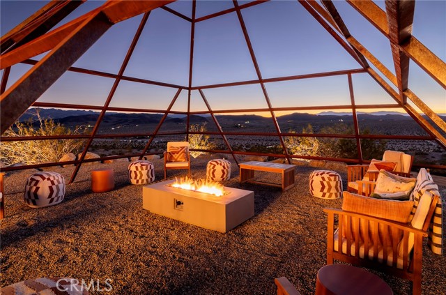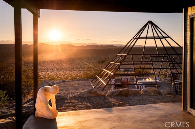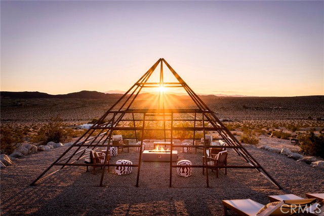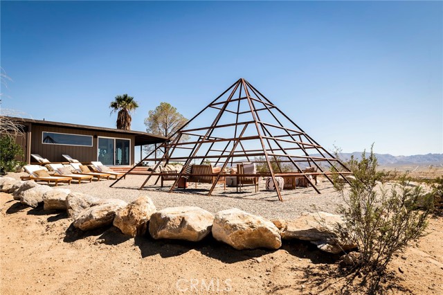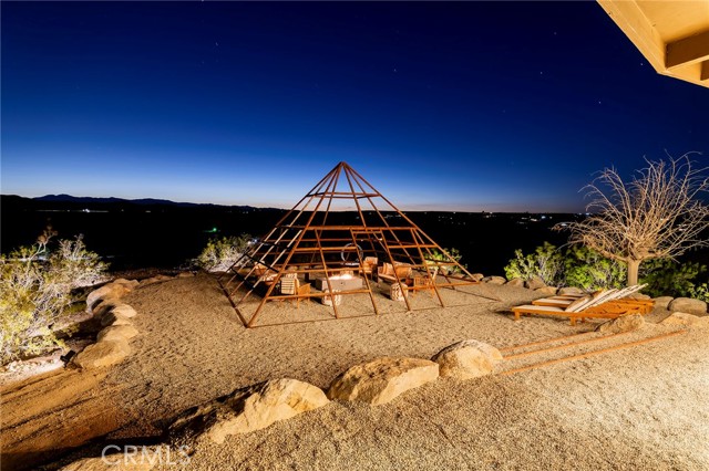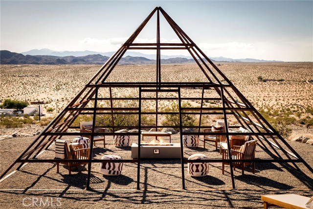 29 WEST PYRAMID HOUSE: Perched on the top of its own mountain, this striking 2-bedroom, 2-bathroom retreat delivers 360-degree views spanning Indian Cove in Joshua Tree National Park, Big Bear, and San Gregorio. Framed by dramatic imported boulders and pristine desert landscape, the property offers a rare blend of privacy, serenity, and natural beauty. At night, the dark skies transform into a stargazer’s dream, making this a true High Desert sanctuary. The centerpiece of the landscape is a bold steel-frame pyramid, measuring 24' x 24' x 14', positioned at the mountain’s edge. This dramatic outdoor structure creates a visual anchor and an unforgettable backdrop for both day and night desert living. Inside, the home is curated with Venetian plaster walls, lime wash finishes, and custom vertical plaster striping. The open floor plan is framed by expansive sliding glass doors and an 8-foot picture window, pulling the desert scenery directly into the living space. Spa-inspired bathrooms feature floating vanities, backlit mirrors, wood tile, and marble finishes, blending sophistication with soothing desert textures. A shaded porch extends from the living room, offering a peaceful vantage point for sunrise coffee or evenings under the stars. Custom channel lighting in the living room mirrors the sharp lines of the pyramid, emphasizing the interplay of geometry and desert landscape. The large kitchen showcases brand-new counters, custom cabinetry, and generous storage designed for both everyday use and stylish entertaining. Centrally located at the edge of 29 Palms and Joshua Tree, this property is just minutes from both villages, with easy access to shops, restaurants, and Joshua Tree National Park. Blending bold design, natural elements, and complete privacy, this mountain-top retreat embodies modern desert living at its finest, the kind of home you’d expect to see in the pages of Architectural Digest.