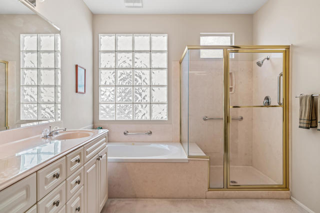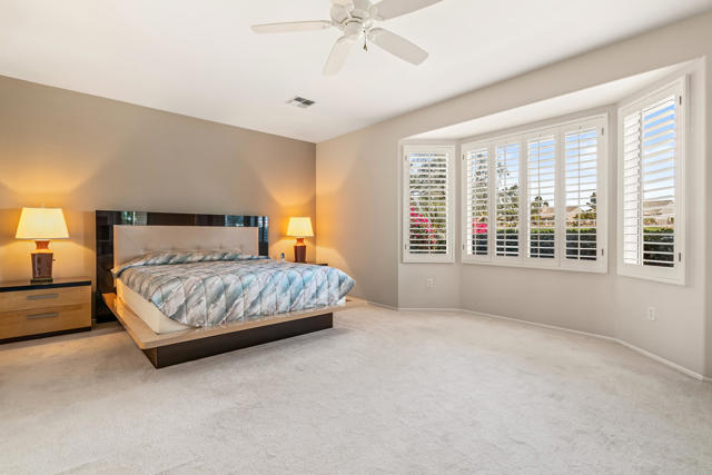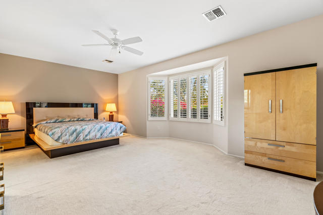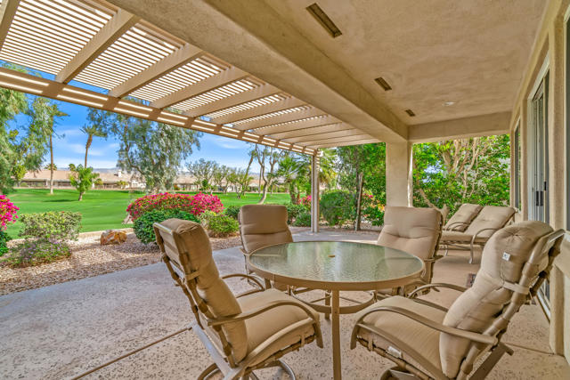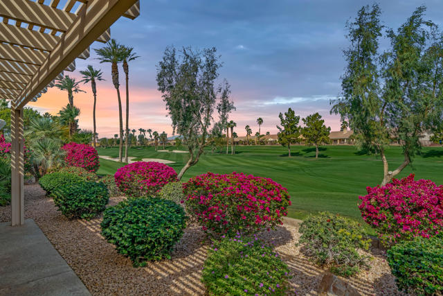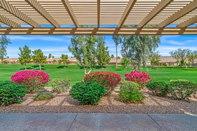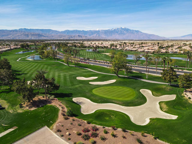 BREATHTAKING and BEAUTIFULLY APPOINTED, this popular St. Croix plan in Sun City Palm Desert is centrally located and offers PANORAMIC MOUNTAIN VIEWS from the front and SPETACULAR elevated wide GOLF COURSE AND MOUNTAIN VIEWS from the rear - the very best in desert living is present here! Enter through your PRIVATE GATED COURTYARD into a BRIGHT Foyer with elegant tile flooring, plantation shutters, and recessed lighting. The open layout flows effortlessly, creating a sophisticated environment perfect for entertaining. The well equipped kitchen features bullnose counters, center island, and stainless appliances including a Monogram ceramic glass radiant cooktop and new convection oven. A cozy breakfast nook overlooks the courtyard and stunning views of the Santa Rosa Mountains. Ample cabinetry has under cabinet lighting with a built in writing desk and hutch. A breakfast bar opens to the spacious great room with angled fireplace and large dining area orientated to showcase breathtaking fairway and mountain views. Step outside to a private backyard retreat with an Alumawood pergola, lush landscaping and wrap around San Gorgonio 18th fairway vistas. This desirable elevated lot is situated opposite the golf cart path and away from tee boxes for maximum privacy, making it ideal for year round enjoyment. Offering 2 bedrooms, 2 bathrooms with Toto toilets, a den, and bonus room with pocket door entry with courtyards views. The den is configured as a home office with bespoke cabinetry, down lit counters, peninsula desk, crown molding and beveled glass display cabinets with puck lighting. The large primary suite features a bay window and offers direct rear patio access! The ensuite bath includes dual vanities, soaking tub, glass block window and shower. A generous walk in closet is conveniently adjacent. The laundry room provides plentiful cabinetry and utility sink. The 2 -car garage and golf cart garage space has been extended 4 1/2 feet and offers 2 walls of cabinets for ample storage and side door access to the exterior. With DRAMATIC MOUNTAIN and ELEVATED FAIRWAY VISTAS, EXTENSIVE UPGRADES and PRISTINE CONDITION, this home is move-in ready and perfect for those seeking an EXTRAORIDINARY GOLF COURSE LIFESTYLE! Enjoy all the amenities at Sun City Palm Desert, a 55+ master planned community offering 2 championship golf courses, 3 club houses, pools, fitness centers, tennis/pickleball/bocce courts and a full calendar of clubs and social events. COME LIVE THE DREAM!