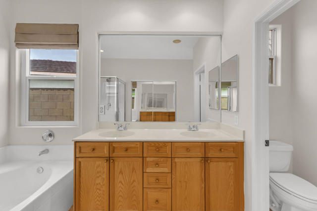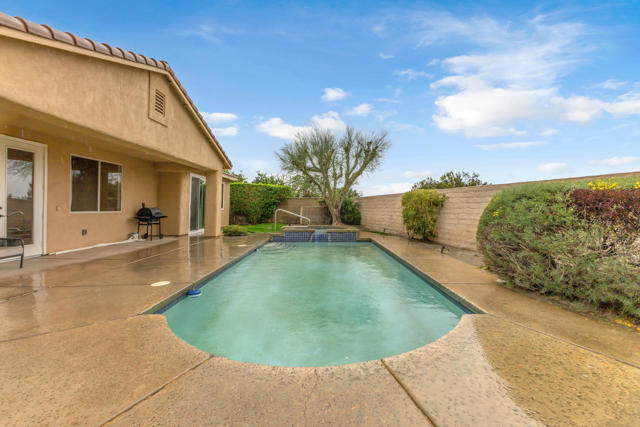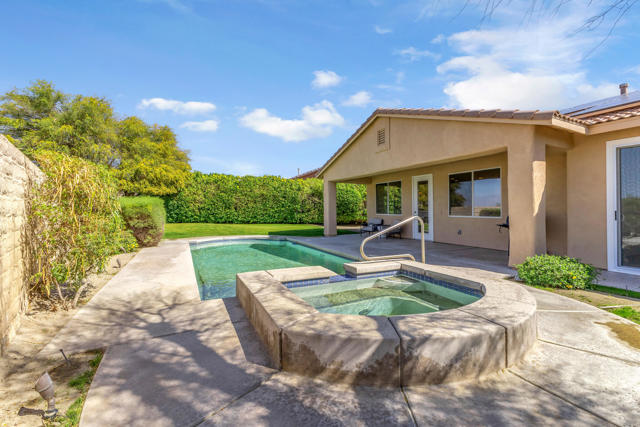 3-bedroom, 2-bath single-family residence located in the La Paloma community of Cathedral City. It features a formal dining area that serves as a versatile bonus space-- for entertaining, work from home/office, or additional living. There is a breakfast nook close to the kitchen, an open and spacious living room, and a cozy fireplace.From your private backyard, enjoy stunning mountain views complete with a pool, spa, and a large grass area--perfect for pets, friends, or family! The home has been thoughtfully upgraded with warm wood-look tile flooring and a recently painted interior and exterior, offering a fresh, modern canvas. There is an attached two-car garage with smart home integration. Lastly, energy-efficient solar panels have been installed and financed at the rate of $415.52 monthly.Additional improvements include a Lennox central split A/C system installed in 2018 and the water heater replaced in 2021. This home is ready for your next chapter- come see the warmth, comfort and charm of this listing.