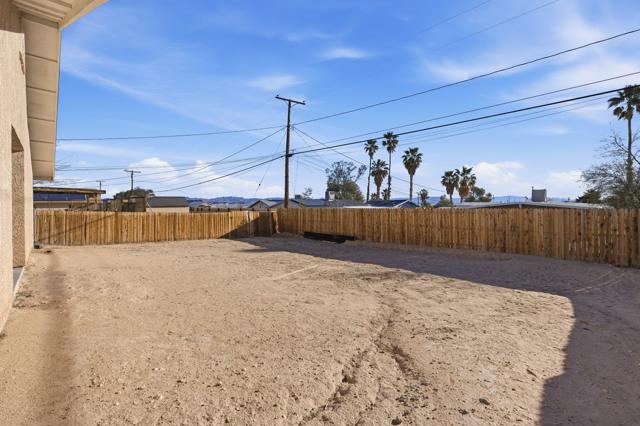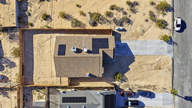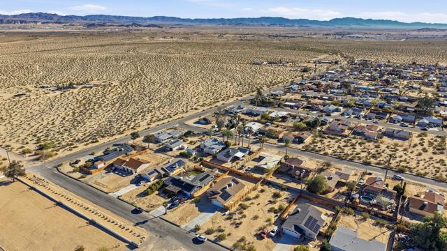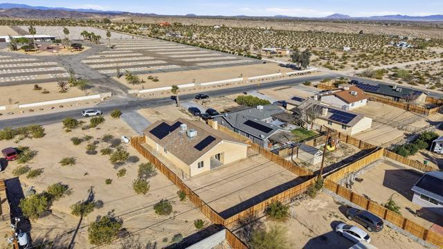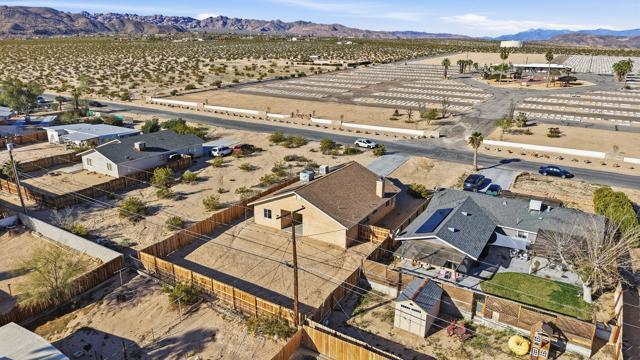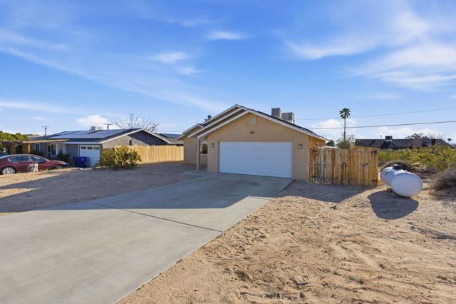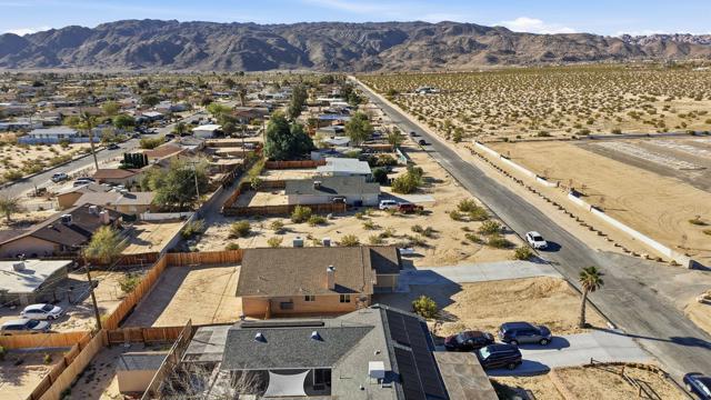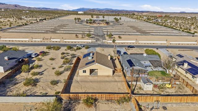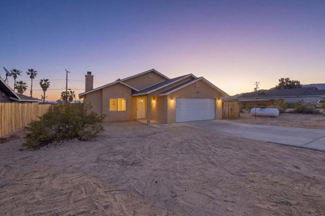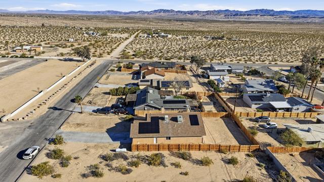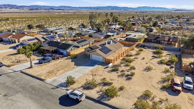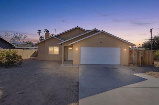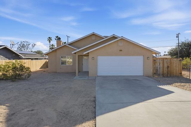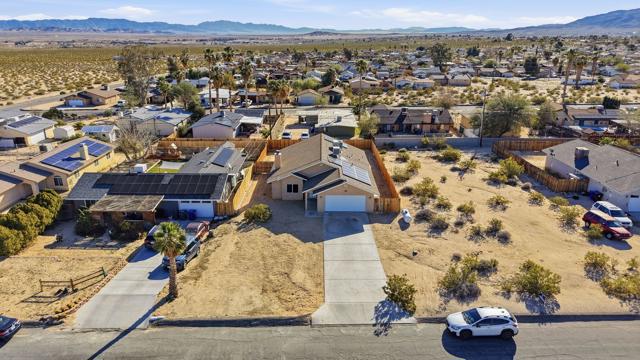 This charming three bedroom, two bathroom home in a great quiet neighborhood of 29 Palms is ready for its next owner to call it home. The property features an inviting floor plan, a cozy fireplace, and a spacious fenced yard perfect for relaxing or entertaining while enjoying beautiful mountain views. Additional highlights include a two car garage and fully paid off solar, offering both convenience and energy efficiency. There is low vehicle traffic in the neighborhood, you are walking distance to desert trails and ATV/dirt bike riding. Conveniently located near the Marine Base, local shopping, and the entrance to Joshua Tree National Park, this home offers both comfort and accessibility to some of the area's most popular destinations.This is a wonderful opportunity to own a truly special home in a desirable area. Schedule your private showing today.