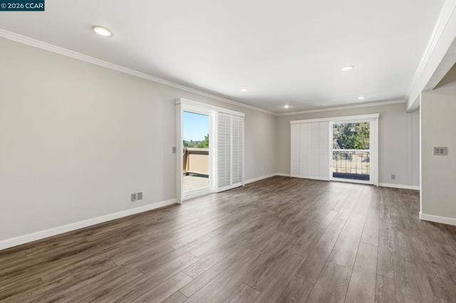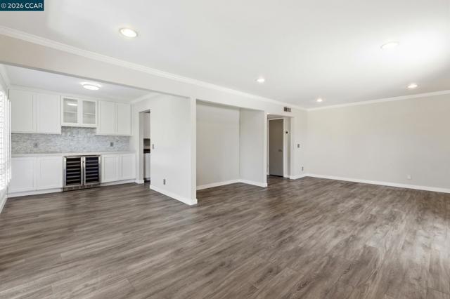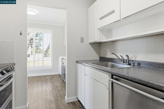 Stylishly updated end-unit condo with a large private deck & custom built-in entertaining bar, ideally located near Downtown Walnut Creek, BART, shopping, dining & entertainment. The open living areas feature wide-plank LVP flooring, recessed lighting & plantation shutters. Sliding glass doors extend the living space outdoors for dining or unwinding after work, while the end-unit location adds privacy and natural light. A standout feature is the custom built-in bar with white shaker cabinetry, stone counters, tile backsplash & dual beverage refrigerator, a rare upgrade in similar homes. The kitchen includes white cabinetry, stainless steel appliances & generous counter space in a functional galley layout connected to the dining area. A separate covered balcony provides an additional outdoor retreat. The bedroom offers large windows & an oversized closet, while the bathroom includes an extended vanity with ample counter space & a shower/tub combination. Additional highlights include assigned parking & separate storage. Residents enjoy resort-style amenities including 3 pools, tennis & basketball courts, fitness center, spa, steam room, clubhouse & car wash station, plus access to nearby walking and hiking trails.