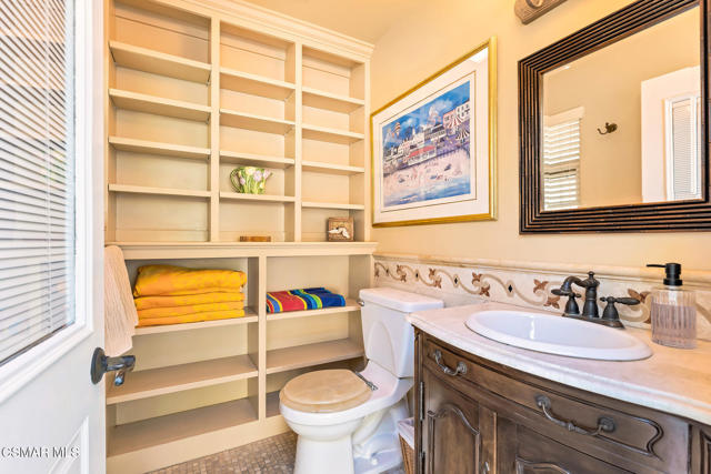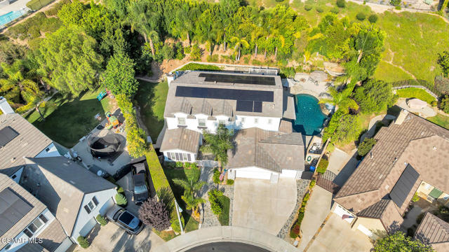 A Private Cul-de-Sac Retreat in Prestigious Silverthorne. Set on a prime cul-de-sac lot in one of northeast Simi Valley's most desirable hillside communities, this beautifully appointed Silverthorne Plan 2 combines luxury living, everyday comfort, and a lifestyle surrounded by scenic trails, neighborhood parks, and the Simi Hills Golf Course just moments away. Featuring 5 bedrooms, 3.5 baths (one bedroom and full bath down) and resting on a 19,166 sq. ft. lot, the property makes a lasting first impression with lush landscaping, palms, roses, and colorful flowers framed by tall hedges for privacy. A three-car driveway with river rock and brick accents leads to a white iron gate and serene courtyard patio with a bubbling fountain. Brick pillars, outdoor lighting, and a tall etched-glass entry door set the stage for soaring ceilings and light-filled interiors. The formal living and dining rooms are welcoming, with tall windows, crown molding, and a sense of openness ideal for entertaining. At the heart of the home, the kitchen combines style and function with crisp white cabinetry, tiled floors, a large center island with seating, a spacious walk-in pantry, and a sunny garden window overlooking the backyard. Top-of-the-line appliances include a 5-burner cooktop, built-in microwave, and double ovens, making this kitchen as functional as it is inviting. The adjoining dining area opens to the patio, while the family room offers a custom wood entertainment niche, a raised hearth stacked stone fireplace, and wide windows that frame the outdoor retreat. The floorplan includes a convenient downstairs bedroom and full bath, plus a laundry room with sink, cabinets, and direct access to the three-car garage. Upstairs, the primary suite is a private sanctuary with a large balcony overlooking the backyard. The en-suite bath offers dual vanities, a soaking tub, a glass-enclosed shower, a makeup station, and a walk-in closet. Three additional bedrooms upstairs are generously sized and served by a hall bath with dual sinks and a separate tub and shower. The backyard is a true showpiece with a Pebble Sheen saltwater pool and raised spa accented by stone and river rock finishes, cascading waterfalls, and lush privacy landscaping. An outdoor kitchen with granite island seating, refrigerator, sink, BBQ, and searing unit makes entertaining effortless, while the covered patio, grassy side yard, and hillside orchard filled with avocado, peach, lime, tangerine, and kumquat trees add to the sense of California living. An outdoor bathroom serves the pool area, and a shaded hammock nook invites relaxation. Every detail, from the river rock hardscape to the thoughtfully placed landscape lighting, creates a private resort setting perfect for day or night enjoyment. Additional highlights include a paid-for 34-panel solar system, dual-pane windows, recessed lighting, intercom, alarm system, generator transfer switch, under stairs storage, mountain views, newly glazed tile and showers in all bathrooms, and newer water heater. Combining elegant interiors, exceptional curb appeal, and a backyard designed for entertaining, this residence offers not only a home but a lifestyle in one of Simi Valley's most sought-after communities.