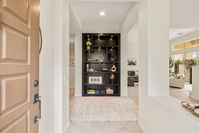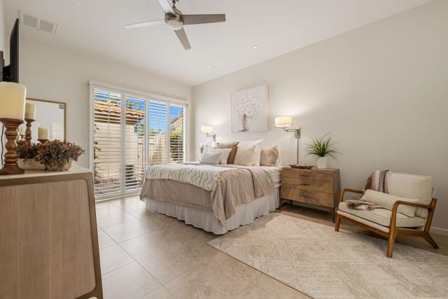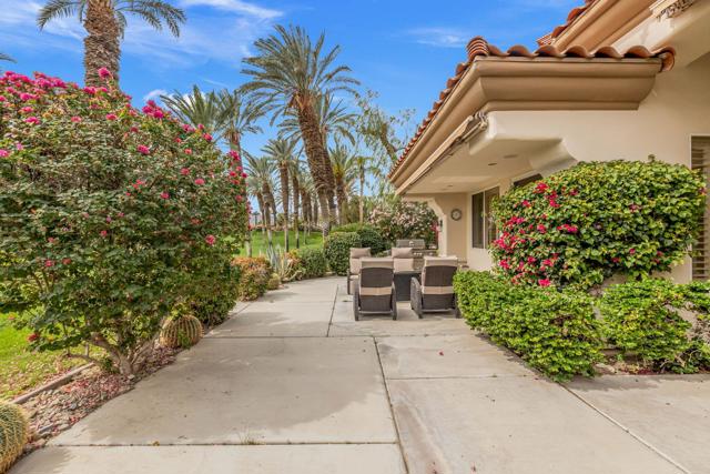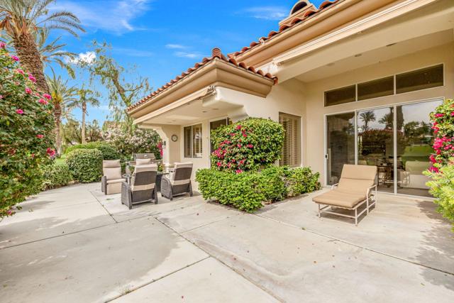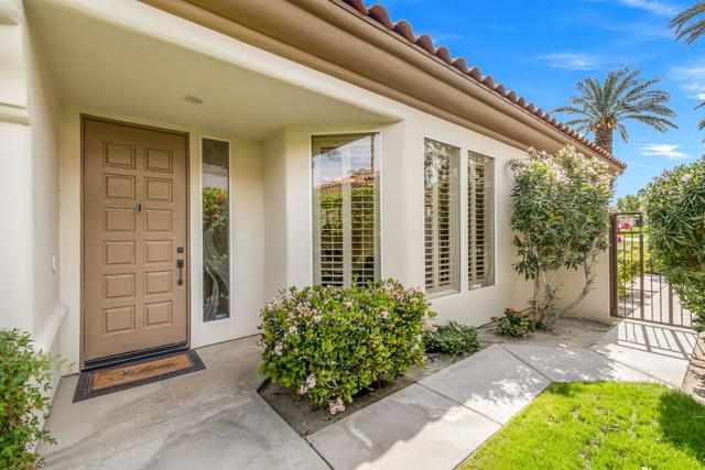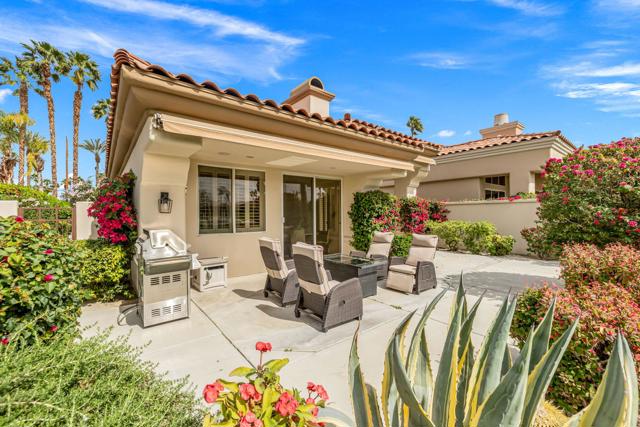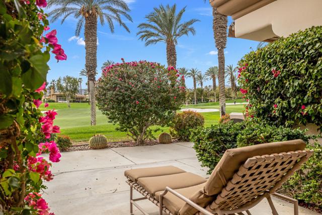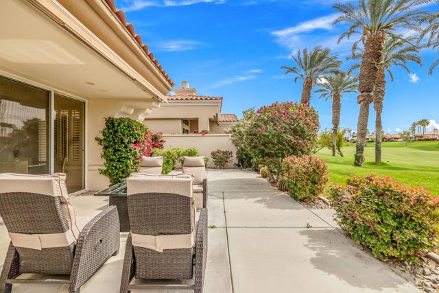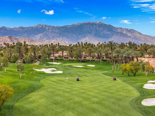 Rare, South-Facing Detached Gem in Indian Ridge Country Club. Experience the perfect blend of charm, privacy, and effortless desert living in this highly sought-after detached Mesquite 4 residence, ideally positioned along the 12th hole of the Grove Course at Indian Ridge Country Club. Rarely available, this free-standing home with no common walls lives like a true single-family residence, complete with a private golf cart garage and a coveted south-facing orientation that captures all-day sunshine and breathtaking views. Spanning approximately 2,197 square feet, the home features 3 spacious ensuite bedrooms plus a powder room, offering an ideal layout for both relaxed everyday living and stylish entertaining. Offered furnished per inventory, this home is ready for immediate enjoyment. Inside, a light-filled interior welcomes you with a generous living room with wet bar and a versatile formal dining space, perfect for hosting or unwinding. The gourmet kitchen features a casual dining nook and flows seamlessly to the outdoor patio where you'll take in panoramic fairway views framed by the Santa Rosa Mountains, creating a truly serene desert backdrop. Tucked away on a tranquil cul-de-sac, the home is just moments from one of the community's 37 pools and spas, offering resort-style living right outside your door. At Indian Ridge Country Club, members can enjoy an unmatched lifestyle with two Arnold Palmer signature golf courses, tennis and pickleball, a state-of-the-art fitness center, full-service spa, and a vibrant social scene, all just minutes from the renowned dining and shopping of El Paseo. Club Membership available with no wait. A rare opportunity to own a detached home in one of Palm Desert's most desirable private communities, this is desert living at its finest. Schedule your private showing today