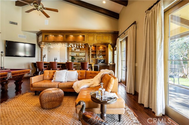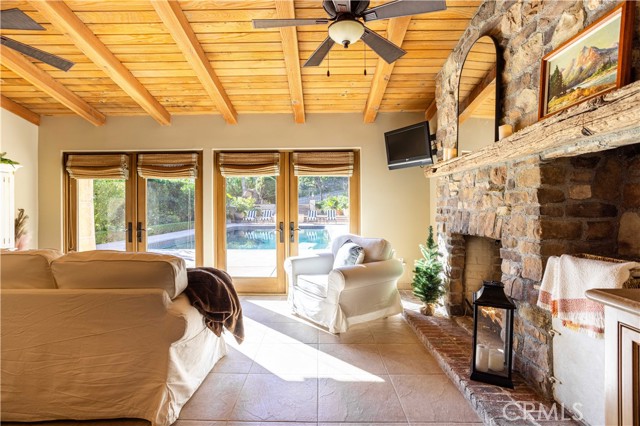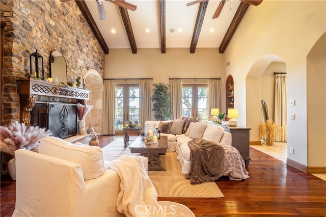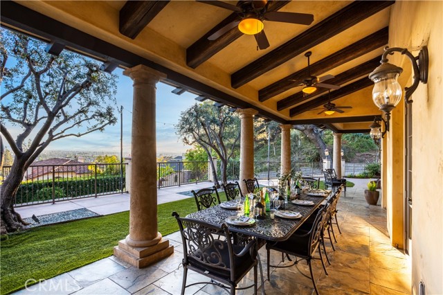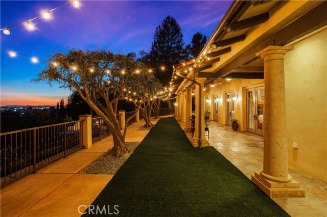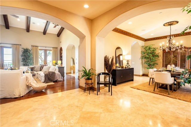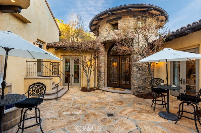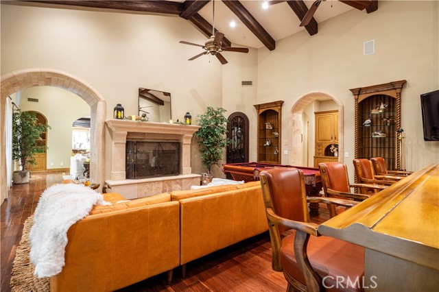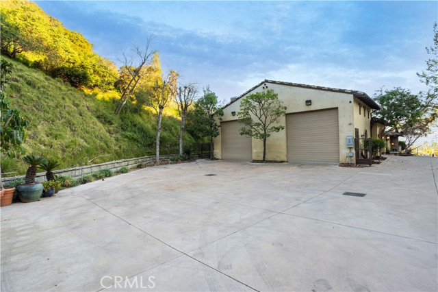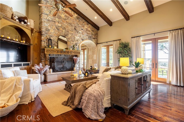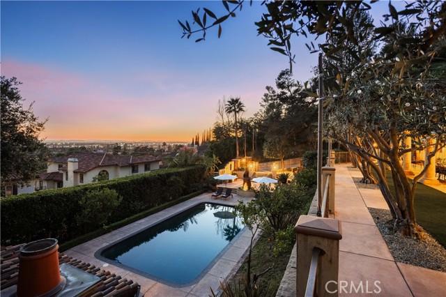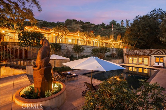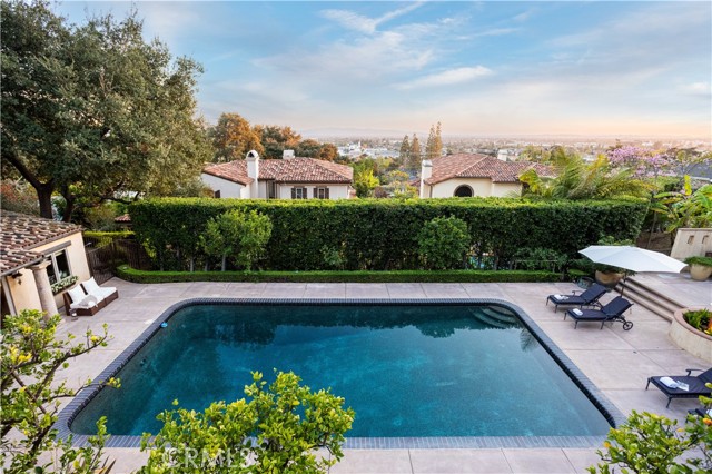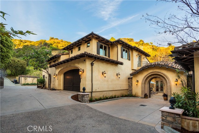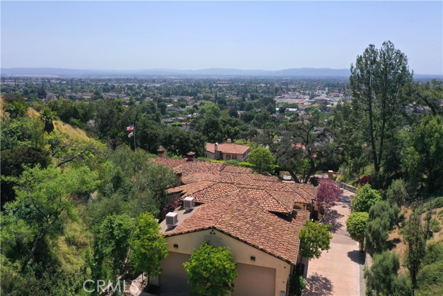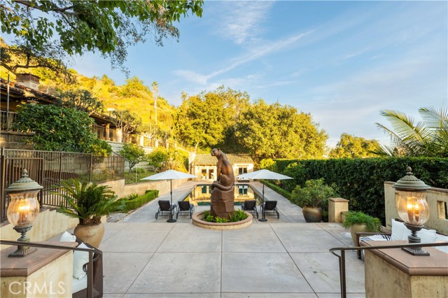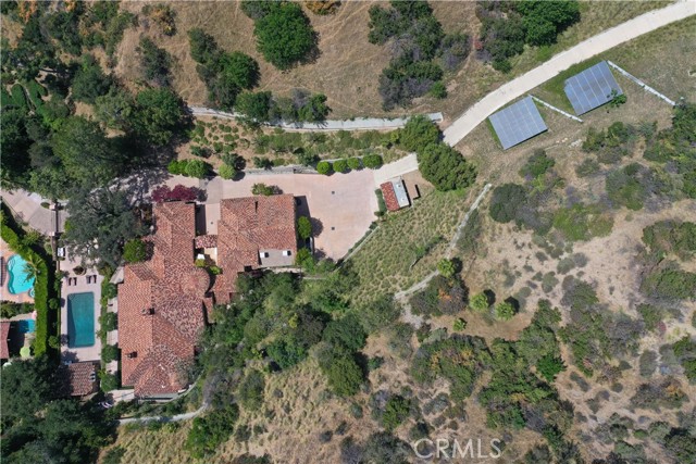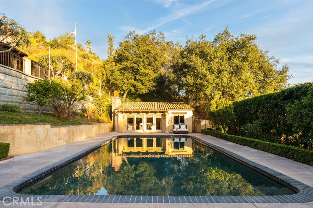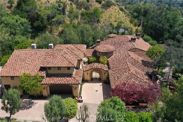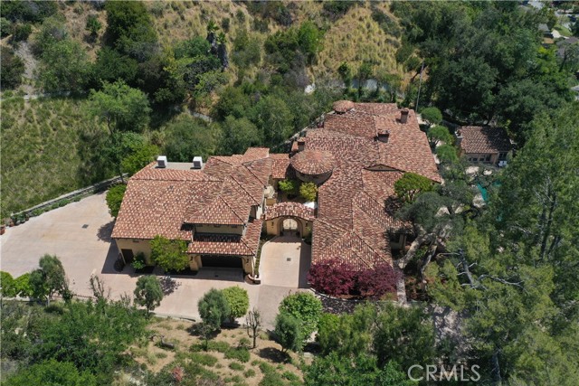Perched majestically in the foothills of Monrovia, this one-of-a-kind Italian villa-inspired estate offers an unparalleled lifestyle defined by privacy, luxury, and sweeping city views. Sprawling across 13.12 acres, the property features a masterful 4,968 sq. ft. single-level main residence where architectural elegance meets seamless indoor-outdoor flow. The journey begins in a tranquil courtyard with a soothing fountain, leading through a grand foyer into a floorplan designed for sophisticated entertaining. The formal living room, marked by soaring vaulted ceilings and a massive stone double-sided fireplace, transitions into an expansive family room. This space is a connoisseur's dream, equipped with a full wet bar, wine cellar, wine fridge, and built-in cappuccino machine. Both rooms feature French doors opening to a vast covered patio framing breathtaking vistas. At the heart of the home lies a chef’s kitchen, meticulously appointed with professional-grade appliances, double ovens, a warming drawer, and a large center island with a new cooktop. Granite countertops, custom cabinetry, and a walk-in pantry provide abundant storage, while the breakfast area and built-in desk offer everyday functionality. The kitchen flows gracefully into the formal dining room, perfect for large-scale gatherings. The primary suite is tucked privately at the rear of the home, featuring a fireplace, cedar-lined walk-in closet, and a spa-like bathroom with dual vanities, a soaking tub, and a multi-head steam shower. Three additional bedrooms, two full bathrooms, and two powder rooms ensure comfort, while a dedicated office with built-in bookcases provides a quiet workspace in a private wing. Beyond the main residence, a 2,164 sq. ft. vehicle storage garage with an integrated workshop is topped by a charming 895 sq. ft. upper-level apartment. This guest unit includes a balcony, full kitchen, and two bedrooms, with infrastructure for an elevator. The lower tier is an entertainer's paradise, featuring a sparkling pool, outdoor fireplace, and a 520 sq. ft. pool house with its own kitchen, living area, bedroom, and bath. This estate is rounded out by a solar system, multi-zone HVAC, and a whole-house vacuum, offering a rare blend of Mediterranean inspiration and modern efficiency.