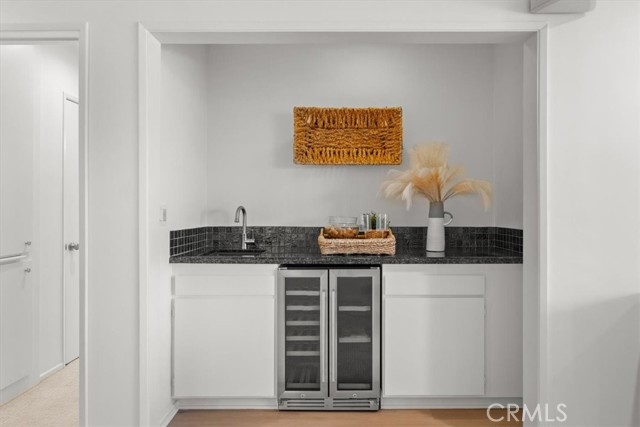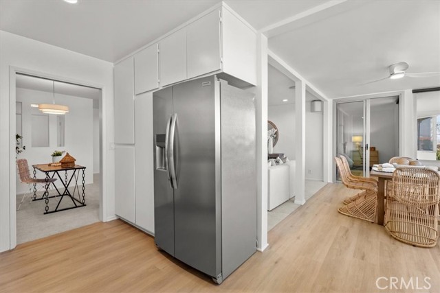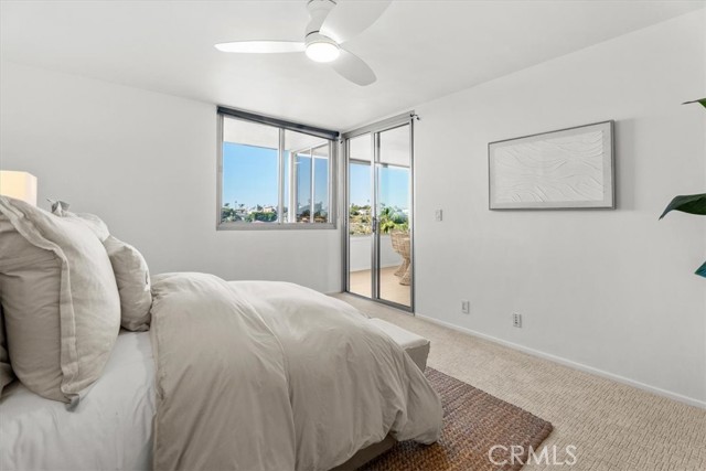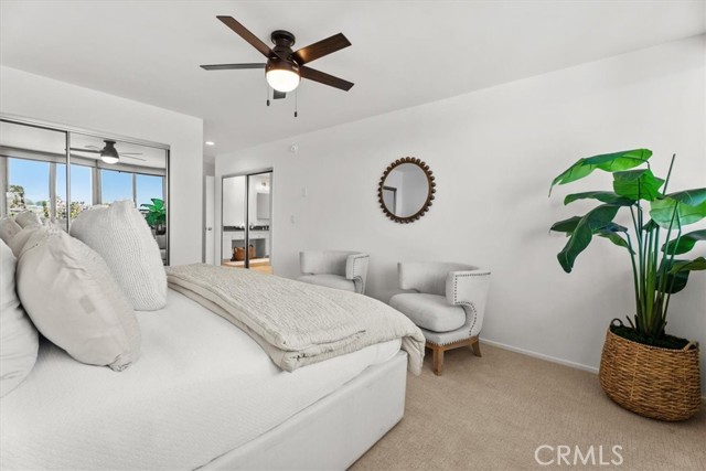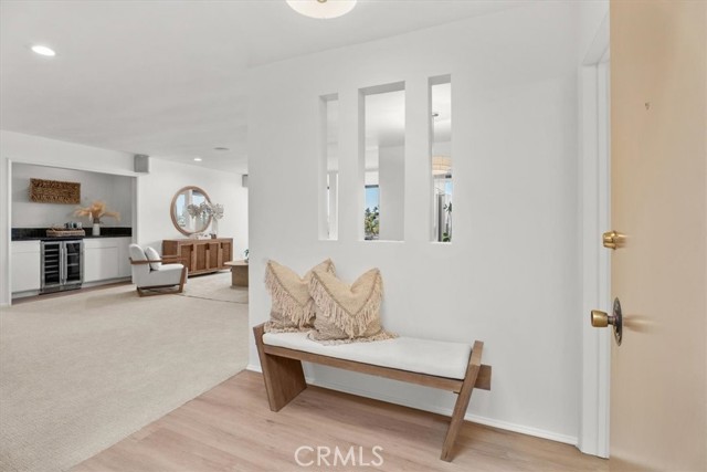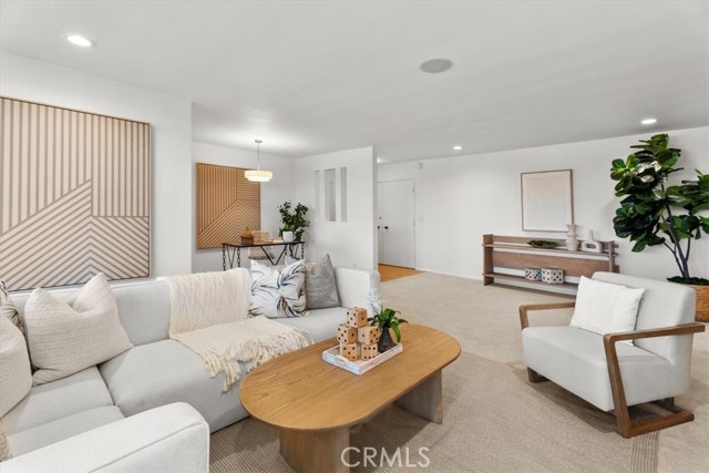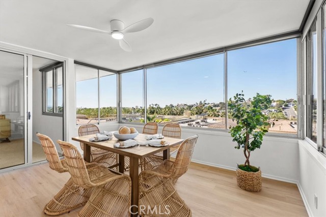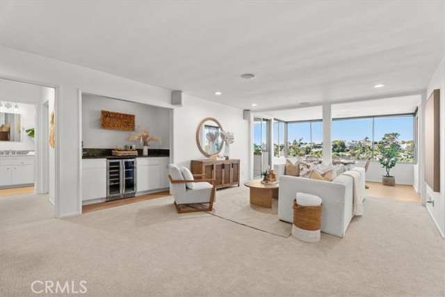 The Briarcliff, a Mid Century Modern building. Perched on the top floor with a desirable west-facing orientation, this light-filled residence captures stunning natural sunlight throughout the day and warm sunset tones in the evening, peek-a-boo ocean views and scenic neighborhood hillside vistas. Expansive picture windows serve as a striking focal point, beautifully framing the surroundings while creating an airy, open atmosphere. The elevated position enhances both privacy and tranquility, offering a peaceful retreat above it all. The inviting and relaxing living area is designed for both comfort and style, seamlessly flowing into the dining and entertaining spaces and enhanced with surround sound speakers, making the home theater ready for an immersive entertainment experience. A thoughtfully appointed wet bar features a dual-zoned beverage refrigerator, ample storage, and a stone countertop—perfect for hosting or unwinding at the end of the day. The spacious kitchen is well-appointed with all stainless steel appliances, including an extra-wide range, and offers ample room for a café table or casual dining nook—ideal for morning coffee or relaxed meals. The primary suite is a true retreat, offering an en suite bathroom with a dual vanity, stone countertops, a large shower with a frameless glass door, skylight, and the rare convenience of three closets. The second bedroom is equally impressive, featuring a spacious walk-in closet and sliding glass doors that open to the atrium, creating a unique indoor-outdoor connection. The hall (guest) bathroom is tastefully finished with a glass shower door, stone countertop, and skylight, filling the space with natural light. New solid surface flooring enhances the entry, bathrooms, kitchen, and atrium, while new carpet, fresh paint, and new light fixtures add a crisp, clean, and modern feel throughout. The open atrium is a standout feature, offering a serene, treehouse-like setting where you can relax and take in the beautiful views and stunning sunsets. Additional highlights include allowance for an in-unit washer and dryer per the HOA, side-by-side parking, and a private storage unit in the garage. Residents enjoy access to a large pool centrally located within the complex, complete with chaise lounges and tables—perfect for relaxing, entertaining, and enjoying the coastal lifestyle. This exceptional top-floor home blends comfort, functionality, and picturesque surroundings in a truly special setting.