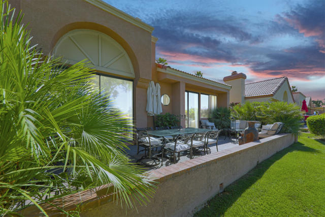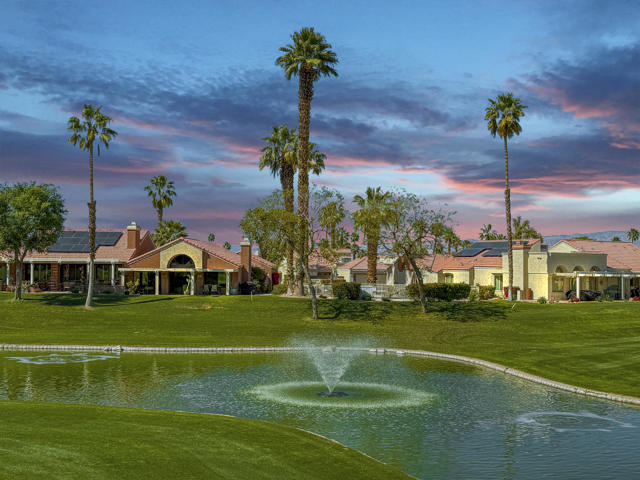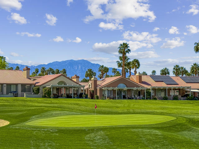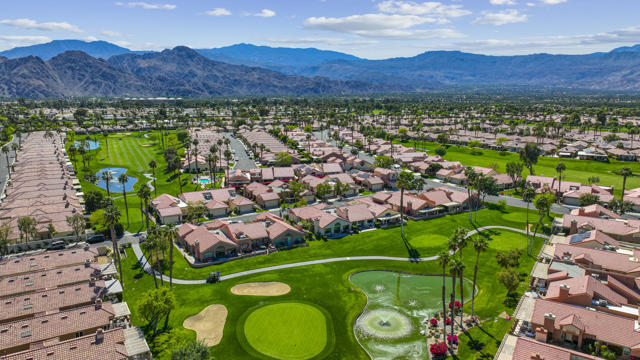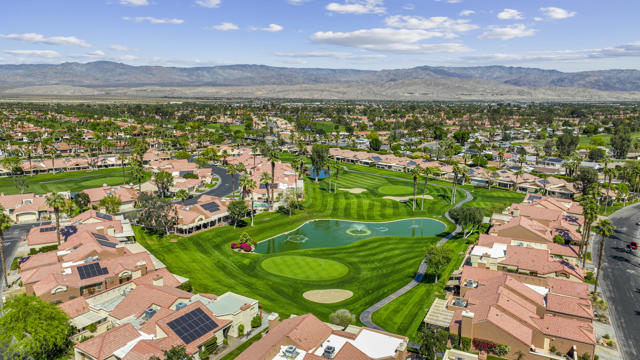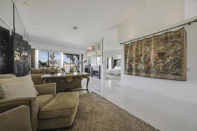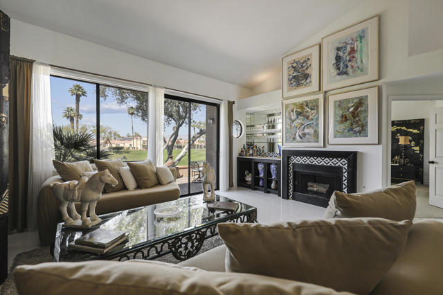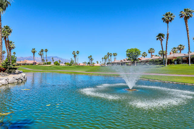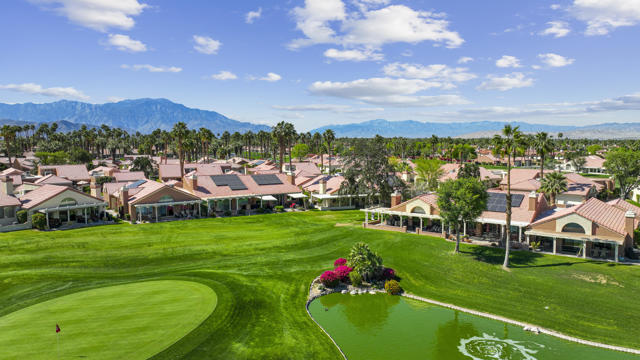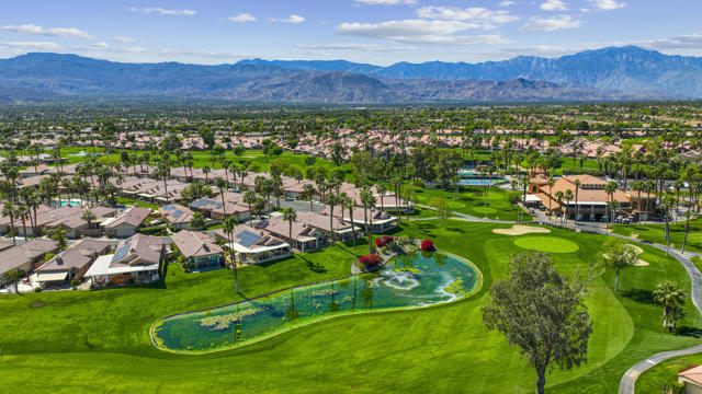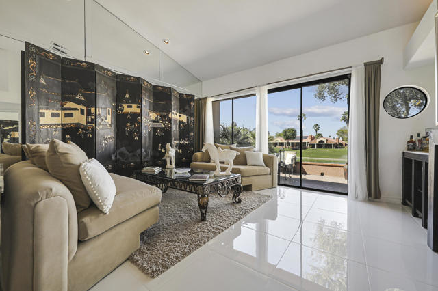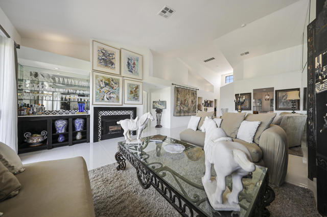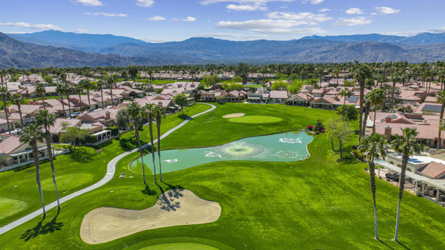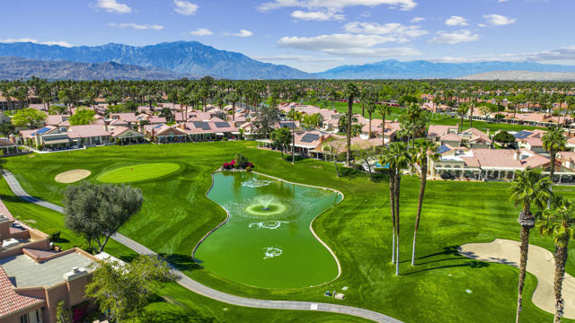 Located within the prestigious Oasis Country Club, this distinctive residence is one of only 11 executive models in a 662-home community, offering exceptional privacy and architectural presence. The home is located on the golf course featuring dramatic 22-foot ceilings, expansive natural light, and an open, modern interior. Positioned on an elevated lot overlooking the 14th fairway of a highly regarded championship golf course, it enjoys sweeping approximately 160-degree panoramic views spanning Palm Springs, the San Bernardino Mountains, and the Coachella Valley.The thoughtfully designed floor plan includes two private bedroom suites--a primary suite and a junior suite--each with en-suite baths, along with an additional powder room. The primary bathroom showcases soaring ceilings, creating a spa-like retreat. Recent upgrades include premium imported Italian porcelain tile flooring and porcelain slab countertops throughout the kitchen and bathrooms, blending contemporary elegance with durability.Fully remodeled in 2023 with over $100,000 invested in high-quality upgrades.Outdoor living is enhanced by two private patios. The south-facing, gated entry courtyard features a fountain and lush landscaping, while the rear patio is ideal for dining, grilling, or enjoying sunset views perched over golf course views. Both patios and the two-car garage feature custom finishes.The Oasis Country Club is a centrally located, member-owned community known for its strong management and exceptional amenities, including fine and casual dining, Ted Robinson designed 18-hole golf course, an 18-hole putting course, tennis and pickleball courts, multiple pools and spas, and 24-hour guard-gated security. This property offers a refined desert lifestyle in one of Palm Desert's most sought-after communities.
