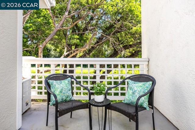 Desirable Ashford Court Community. Tucked away in the back of the complex, this quiet upstairs unit has views of the Iron Horse Trail. Two stories within the unit - feels like a townhome. Kitchen, living and dining rooms plus a half-bath are on the lower level. Bay window in kitchen makes cooking pleasant. Living room has recessed lighting and a stack stone surround fireplace. Good size deck and a storage closet are right outside of the living room. Two bedrooms = two primary suites, are upstairs. Updated bathroom with stone shower stall. Laundry closet is also upstairs for your convenience. Stack-up washer and dryer are only three years old. New water heater is in the utility closet by the main entrance. Detached garage structure is near the condo unit. Beautiful community pool. Close to transportation conveniences: near BART, Hwy 24 and I-680. Short distance from the bustling downtown for shopping, restaurants and the Art District. Excellent schools in the Walnut Creek School District. Move-in condition. Community gate closes at night.