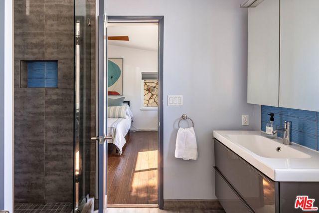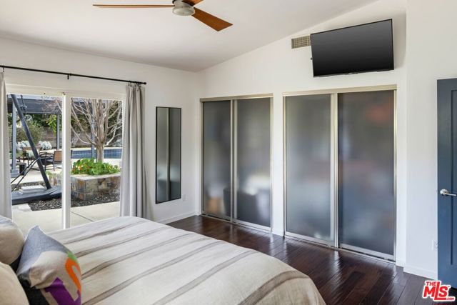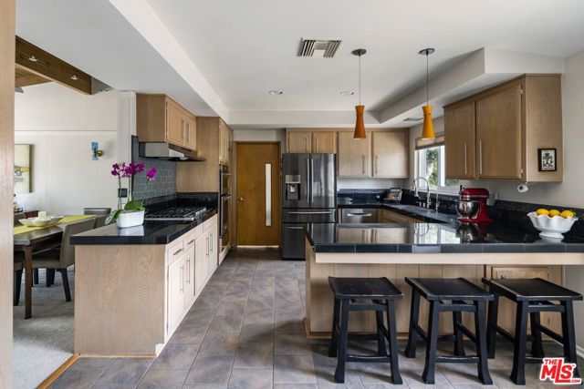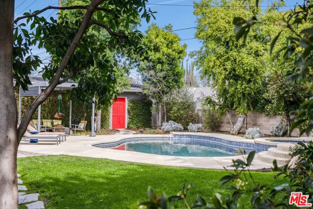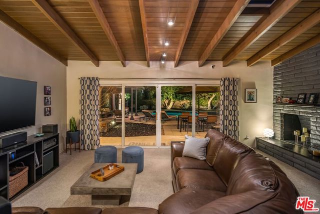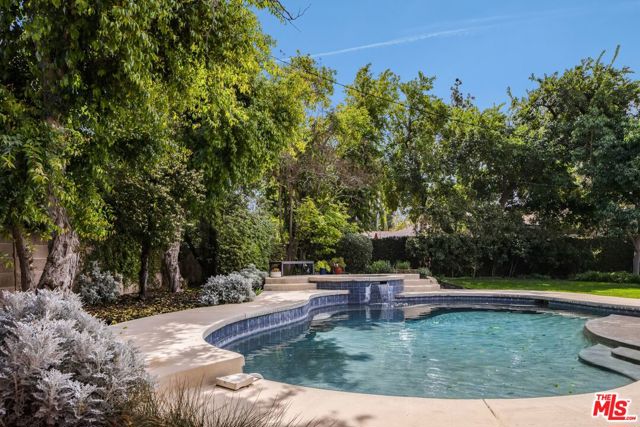 Designed by renowned architect Charles Du Bois, this classic Mid-Century Modern home sits in the sought-after Woodland Hills South neighborhood. Impeccably maintained, it blends timeless design with modern comfort soaring beamed ceilings, skylights, dual fireplaces, and original slate floors welcome you inside.The open single-story floor plan flows beautifully, with the kitchen, den, and living areas on one end and the bedrooms on the other. The kitchen features counter seating, a professional sink, and top-quality KitchenAid and Bosch appliances. A large bonus room off the kitchen is perfect for a fourth bedroom, home office, gym, or playroom. There is a separate laundry room with sink, refrigerator and extra storage. Extras include custom closet buildouts, upgraded doors, an EV charger, and energy efficiency from 51 owned solar panels plus a new roof and insulation (2024).The lush backyard feels like a private retreat with a saltwater pool, spa, waterfall, and shaded pergola. The 30 foot deep detached garage offers space for longer vehicles, workspace flexibility and potential for an ADU. Ideally located near Calabash Charter Academy, Bristol Farms, and Calabasas Commons this is a must-see home that's ready for its next owners!