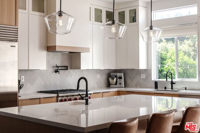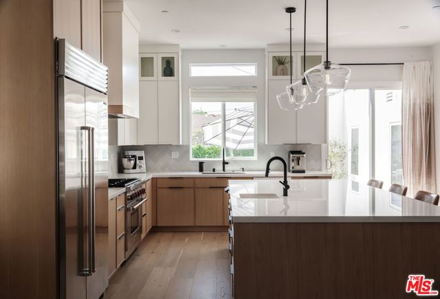 Beautifully reimagined in 2024 and set on one of Culver City's most desirable streets, this contemporary Mediterranean residence offers a two-level, four-bedroom, two-and-a-half-bath main home, complemented by a detached one-bedroom, one-bath guest house with its own private street entrance, as well as a resort-style backyard with a heated pool and spa. Designed for seamless indoor-outdoor California living, the backyard is an entertainer's retreat - featuring a dining deck, fire pit lounge, built-in BBQ, and a pool and spa with Baja shelf, electric pool cover, and advanced salt, ozone, and UV filtration. The main home showcases an open-concept layout with soaring ceilings, white oak flooring, and a wood-and-gas fireplace. The kitchen is both refined and functional, with floor-to-ceiling cabinetry, Wolf and Sub-Zero appliances, a walk-in pantry, and an oversized island that flows effortlessly into the dining area. Sliding glass doors open directly to the backyard, creating a true indoor-outdoor experience. The first floor also includes a powder room, a flexible bedroom or office, and a game room with its own private staircase. Upstairs, you'll find two well-appointed bedrooms with reach-in closets, a dual-sink full bath, and a spacious primary suite featuring a walk-in closet and a spa-inspired bathroom with a soaking tub, oversized shower, and separate water closet. A laundry room with built-in cabinetry completes the upper level. The detached guest house offers a living area with kitchenette, a bedroom with a built-in desk, a full bath, and two mini-split systems. With its private street entrance and direct backyard access, it's ideal for rental income, guests, or a dedicated workspace. Located just moments from Culver City's vibrant restaurant row and The Culver Steps, this home delivers elevated living in one of Los Angeles' most sought-after neighborhoods. Private showings only; kindly contact agent(s) to schedule.