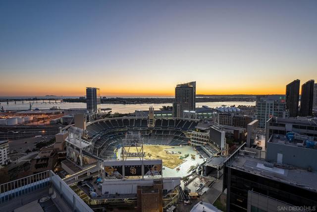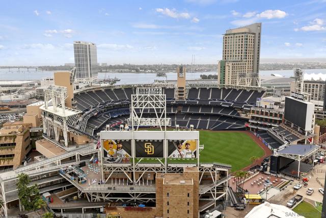 Experience elevated downtown living in this highly customized 2-bedroom, 2-bath residence at ICON, a premier concrete and steel high-rise in the heart of East Village. Sweeping northwest-to-southwest views stretch beyond the skyline to include the San Diego Central Library, distant mountain ranges, and glimpses of the bay. Floor-to-ceiling tinted windows frame the scenery while enhancing privacy and comfort throughout the home. Extensive custom upgrades set this residence apart, including a built-in Sonos sound system discreetly integrated within the walls for a clean, immersive experience. The primary suite is a true retreat, featuring automated blinds and a spa-inspired bath. A stackable washer and dryer are conveniently located in the in-unit closet, and nearly every detail has been thoughtfully customized for modern urban living. ICON delivers a secure, full-service lifestyle with controlled-access lobbies, underground parking, 24-hour on-site property management and staff, and residential trash chutes on every floor. The home includes secure two-car tandem garage parking. Residents enjoy a 1,700-square-foot fitness center with WiFi, a community theater room with raised seating and a 135-inch HD screen, and the 5th Inning Community Lounge with a full kitchen, TV, WiFi, and comfortable seating ideal for larger gatherings. The rooftop Skybox and viewing terrace, located across the street from Petco Park, offer unobstructed ballpark views with BBQs, surround sound, space heaters, and WiFi—perfect for enjoying games, concerts, and city events year-round!