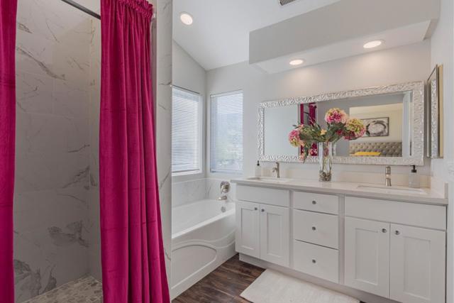 Welcome to 25215 Azalea Court, a beautifully updated two-story home just beyond the gated entry of the desirable Las Palmas, Summer Hill community. Residents enjoy HOA amenities including a pool, parks, and secure access, all surrounded by scenic hills. This 3-bed, 2.5-bath home offers 1,570 sq.ft. with dark laminate wood flooring throughout. Upon entry, you're welcomed by a formal living room and versatile study. The living and dining areas feature a striking dual-sided gas fireplace with stone accents. The remodeled kitchen includes white cabinetry, quartz countertops, stainless steel appliances, a peninsula, and gold-accented hardware. Updated lighting and plantation shutters enhance the modern feel. A whole-house LifeSource water filtration system adds everyday comfort. Upstairs, the spacious primary suite offers vaulted ceilings and a private deck with hillside views. The updated primary bath features a tile shower, soaking tub, and upgraded vanity. Two additional bedrooms share a Jack-and-Jill bath. The backyard offers a concrete patio and low-maintenance landscaping, ideal for relaxing or entertaining. The garage includes built-in storage cabinetry. Move-in ready and ideally located within one of Salinas most sought-after gated communities.