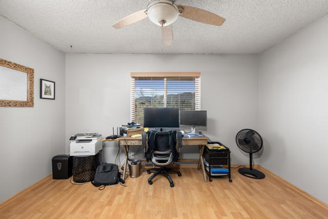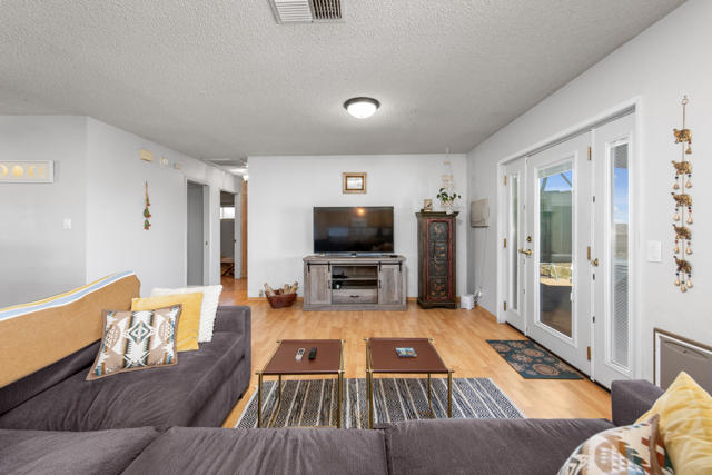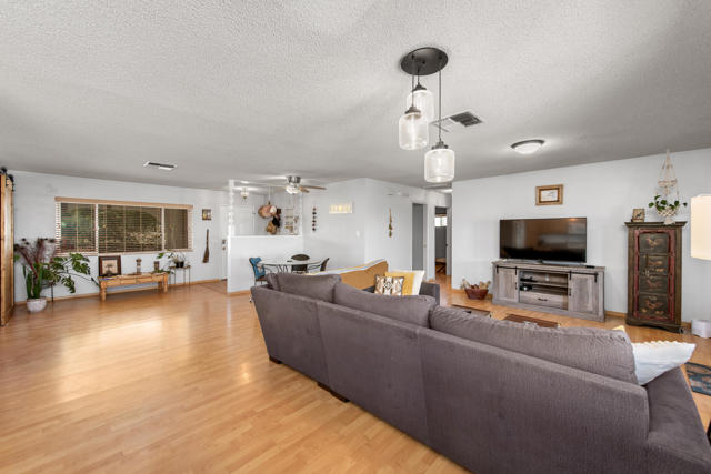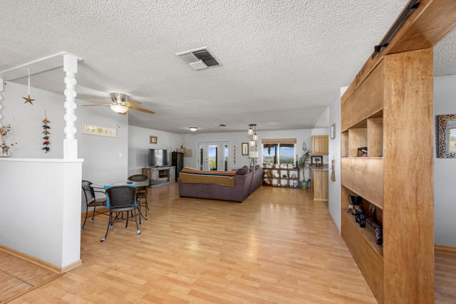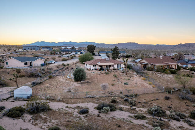 Experience elevated Joshua Tree living at 6773 San Angelo, where sweeping views over Joshua Tree Village, generous living space, and a peaceful close-to-town setting come together in one rare opportunity. This 2 bedroom, 2 bathroom home offers approximately 1,500 square feet of living space in a location that feels quiet and private while still being close enough to enjoy the shops, dining, amenities, nearby hiking trails, and convenient access to the Joshua Tree National Park entrance that make this area so desirable. Set in an ideal orientation to capture beautiful eastern views and natural light, the home features upgraded dual pane windows and an open concept layout that makes the most of the scenery. The spacious bonus room has been sectioned off with a wood bookshelf to create a flexible office area, perfect for working from home, creative space, or added functionality. The guest bedroom offers direct access to the backyard patio, while the primary suite connects through the bathroom to the expansive 2 car garage, creating a practical mudroom-style entry. Outside, the large backyard offers exceptional potential to create the desert retreat you have been dreaming of. There is plenty of space to add an infinity-edge pool that takes full advantage of the property's elevated setting and sweeping views, along with room for an ADU, workshop, outdoor entertaining area, or other future improvements. Both sides of the property offer room for RV parking, trailers, and recreational vehicles, while the front yard provides ample additional parking alongside the oversized 2 car garage. Properties with this combination of square footage, elevated views, usable outdoor space, and proximity to Joshua Tree Village are hard to find. Whether you are looking for a full-time residence, desert getaway, or investment opportunity, 6773 San Angelo is a property you will not want to miss. Schedule your showing today.