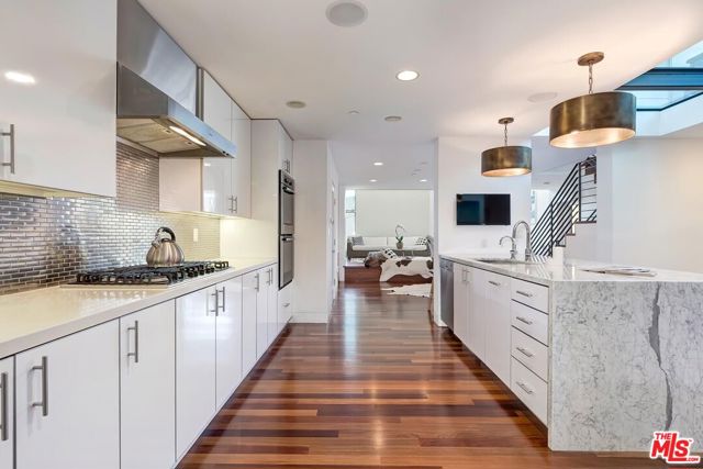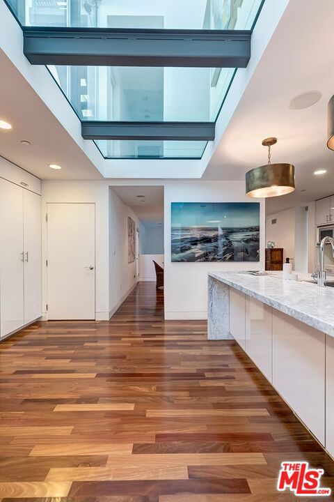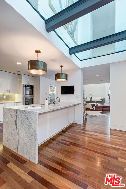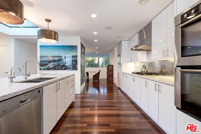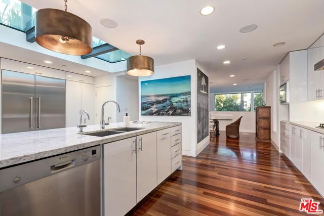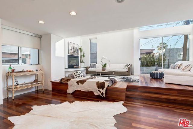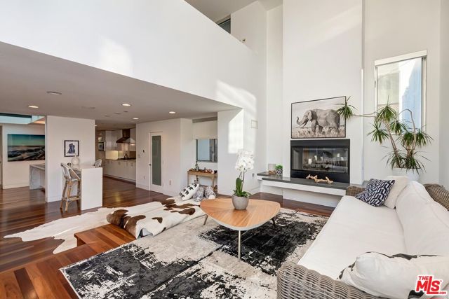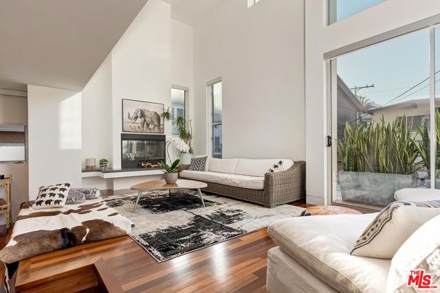 Incredible architectural contemporary residence in prime Marina del Rey, filled with natural light from multiple skylights, soaring ceilings, and hardwood floors throughout. The home features Caesarstone countertops, a private elevator to the rooftop entertainment deck, and an elegant entry. Fireplaces in both the living room and the primary suite, which includes a sitting area, custom walk-in closet, and abundant storage. Multiple terraces on every level offer sweeping views of the ocean, city lights, and mountains, and view of the community garden. Located just a short walk to the water and a myriad of shops. A must see!