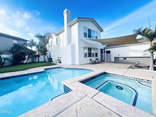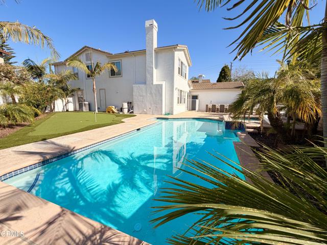 Experience refined California living in this fully remodeled 4-bedroom residence, nestled within one of East Ventura's most desirable neighborhoods. The bonus office is versatile--potentials as 5th bedroom. Thoughtfully curated with designer finishes throughout, the home offers a cohesive blend of modern sophistication and everyday comfort. A multi-zoned Carrier AC system ensures year-round climate control, while a spacious walk-in pantry enhances functionality. No HOA or Mello Roos.The expansive open-concept layout is both elegant and practical, offering distinct yet connected living spaces including a formal living room, an inviting family room, and a dining area that transitions seamlessly into the chef's kitchen. Designed to impress, the kitchen features white shaker cabinetry, quartz countertops, new stainless steel appliances, an oversized center island, and generous storage--perfectly suited for both casual living and elevated entertaining. A main-level den adds flexibility, ideal for a private office, guest suite, or optional fifth bedroom.Upstairs, the primary suite is a true retreat, offering a spa-caliber bathroom with a freestanding soaking tub, glass-enclosed shower, dual vanities, and a well-appointed walk-in closet. Three additional bedrooms provide comfortable and adaptable space for family or guests.The backyard presents a resort-inspired setting designed for both relaxation and entertaining. A heated pool and raised spa serve as the focal point, complemented by a custom outdoor kitchen is upgraded with natural quartzite stone countertop, built-in BBQ and sink, an expansive stamped concrete patio, and mature palm landscaping supported by a newly installed irrigation system. A professionally designed five-hole putting green adds a distinctive touch, while a custom quartz laundry enclosure and a utility sink enhances the home's attention to detail.Additional features include upgraded flooring, recessed lighting, a dedicated laundry room, and an attached two-car garage.Impeccably upgraded and move-in ready, this residence offers a rare combination of design, comfort, and lifestyle--an exceptional opportunity for resort living in Ventura.Listing agent has ownership in the property and is a licensed real estate agent in California.