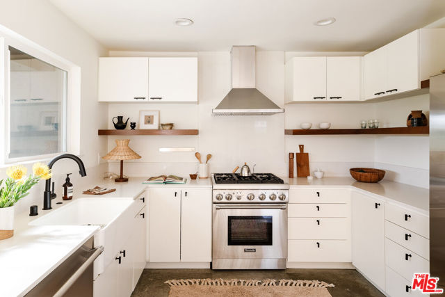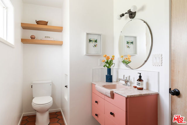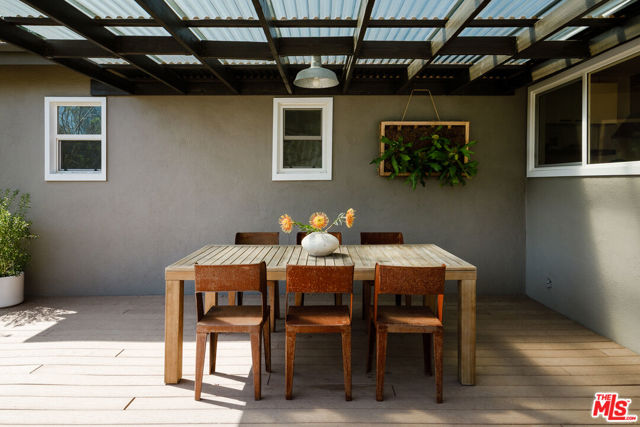 Situated in the hills of Eagle Rock, this beautifully reimagined Mid-Century residence is a true retreat, offering incredible privacy, light-filled spaces, and tranquil treetop views. Elevated above the street and perfectly framed by two mature olive trees, this soulful home offers a sense of calm while being located just moments away from the countless incredible shops and restaurants that Eagle Rock and nearby Highland Park have to offer. Upon entering the home, you are greeted by an abundance of natural light and impeccably designed living spaces that look out to lushly landscaped gardens and verdant views. The open and airy living room features large windows, a stone fireplace, and beautiful custom shelving. Thoughtfully designed for a seamless indoor-outdoor flow, the living room and adjacent dining room's sliding glass doors open to the home's multiple magical outdoor spaces, providing endless possibilities for relaxation and entertaining. The beautifully designed grounds are a true extension of the home, featuring a grassy yard, a sprawling L-shaped deck, a lovely lower patio, original breeze block walls, and gardens with an array of native plants, including sycamore and mulberry trees, and tabebuia. Enjoy morning coffee, alfresco dinner parties, and shaded brunches with family and friends while looking out to hillside vistas. The bright kitchen is a chef's dream, featuring floating wood shelves, polished concrete floors, Cle tile floor accents, Thermador and Samsung appliances, and a sliding window that conveniently opens to the outdoor dining area. The primary bedroom suite is a sanctuary, providing calming views, a spa-like updated en-suite bathroom, and ample closet space. Two well-appointed guest bedrooms share a whimsical bathroom that has been lovingly updated while preserving its original vintage charm - a nod to the home's Mid-Century roots. The bathroom features hexagon Terracotta floor tiles from Mexico, and the original sink and tub, inspired by Eleanor Roosevelt's favorite hue of pink. Downstairs, you'll find a stylish wood-paneled den/office that provides the perfect work from home space or creative escape. This inspiring space features sliding glass doors that lead to a quiet patio, and access to a perfectly designed half bathroom with vibrant blue Cle tile. Additional highlights of the home include a large two-car garage with direct access, a new roof, paid off solar panels, and an EV charger. In addition, this property includes a gently sloping hillside that offers the possibility for expansion, and is located within the coveted Delevan Drive Elementary School district. This incredibly special property captures the true essence of California living, in one of Northeast LA's most desired neighborhoods.