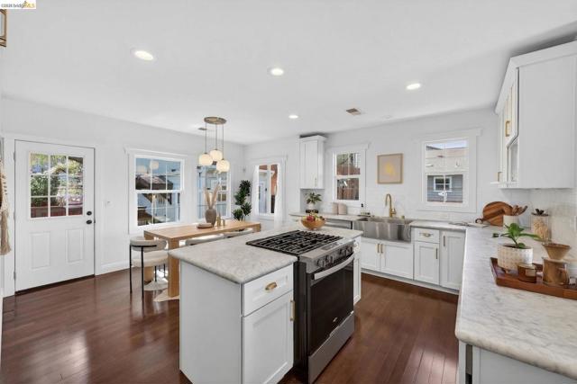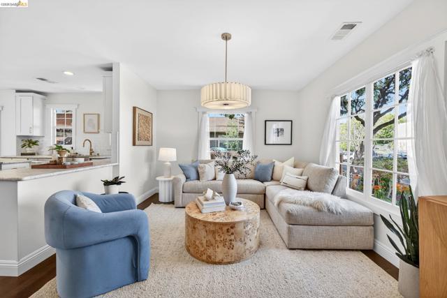 Modernly restored Craftsman on a picturesque, tree-lined street near the Emeryville–Oakland border. Tucked along a quiet single-lane block, yet just steps from favorite shops, restaurants, coffee, parks, and transit, and minutes to Bay Street and the Emeryville Public Market. A lush front garden, cheerful flower boxes, and an inviting enclosed porch welcome you home. Inside, a gracious entry opens to a light-filled, open-concept living room and kitchen. The spacious updated kitchen features a standalone island, stone countertops, built-in cabinetry, stainless steel appliances, and ample storage, with direct backyard access for seamless indoor-outdoor living. The main house offers two generous bedrooms with great closet space and two remodeled baths, including a primary ensuite. Outside, a sunny deck and native landscaping invite relaxation or gardening. And just when you think it couldn’t get better, a detached one-bedroom, one-bath studio provides flexible space for guests, a home office, or creative pursuits. An oversized driveway provides easy parking, though a 95 Walk Score encourages leaving the car behind and enjoying the best of East Bay living.