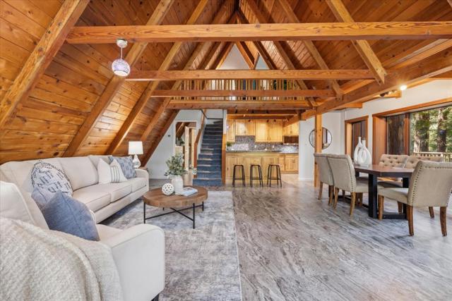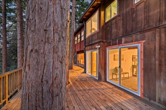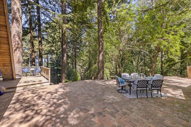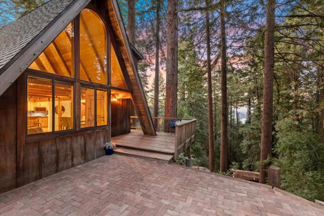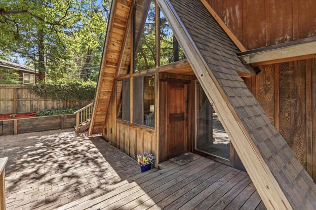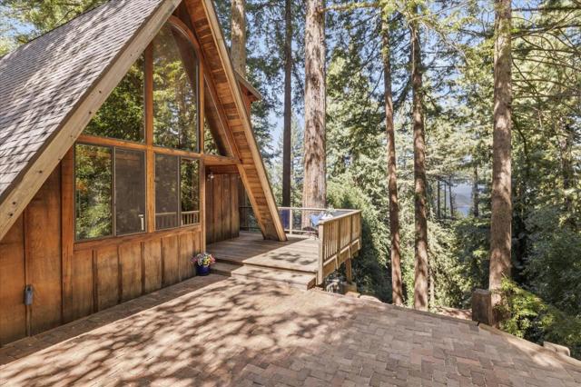 Tucked among towering redwoods and overlooking the shimmering waters of Lexington Reservoir, this enchanting Tahoe-style A-frame cabin blends rustic charm with thoughtful modern upgrades offering a rare opportunity to own two parcels totaling approximately 14,466 sq ft. Step inside and experience a home that truly embraces you. This residence lives much larger thanks to flexible bonus room, converted garage and a versatile shedio perfect for a home office, studio, or additional living quarters. If you need more room, this property delivers creative possibilities that will pleasantly surprise. The home features designer finishes throughout, including custom sinks, countertops, and cabinetry, along with abundant storage. New roof and a spacious brick patio ideal for entertaining under the trees. Outdoor living shines here; Expansive deck surrounded by majestic redwoods, Sunny garden area, Hot tub hookup for relaxing under the stars. Park-like open space and trails from the backyard. Breathtaking reservoir and city light views, and a short walk to Pizzeria Vittoria, Store, post office, pool, park, sports field, and pavilion. More than a home its a warm, inviting mountain escape with room to grow, space to breathe, and a lifestyle to love. Lexington Elem, and Los Gatos High School.