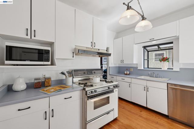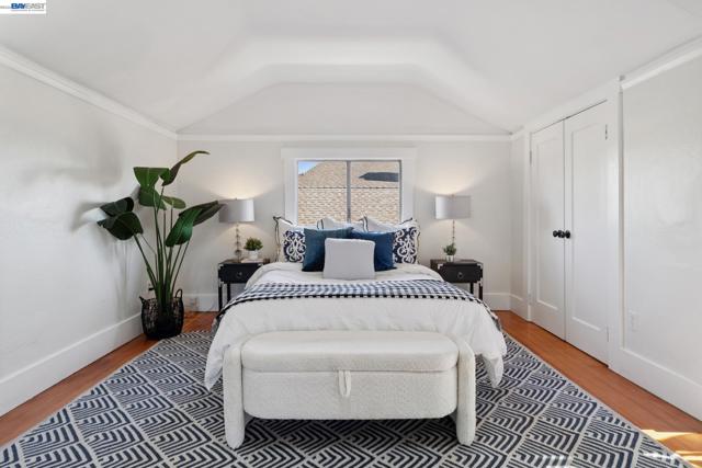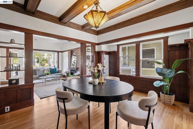 Charming East End bungalow filled with light, warmth and character! Built in 1907, this 3 bedroom, 2 bath home offers 1,624 sq. ft. of inviting living space with refinished wood floors and fresh interior and exterior paint. The living room features a wood-burning stove with a newly working chimney, while the dining room showcases wainscoting, built-in shelves, a box-beam ceiling and a Tiffany chandelier. The kitchen includes an eat-in breakfast nook with booth seating and the laundry room conveniently opens to the huge backyard. Two bedrooms and a shared tiled bathroom with a shower-over-tub are located downstairs, while upstairs offers a spacious bedroom, ample storage, and a bathroom with a skylight. Set on a 4,370 sq. ft. lot, the expansive backyard features a prolific lemon tree, a shady redwood and ample space to relax or garden. Additional highlights include a smart thermostat and newer light fixtures and ceiling fans throughout. A curb cut for off-street parking is currently under review with the City. Ideally located near top East End schools, Encinal Market, and Lincoln Park’s pickleball, bocce, and swimming facilities—this timeless home truly has it all!