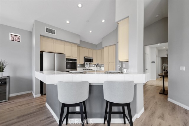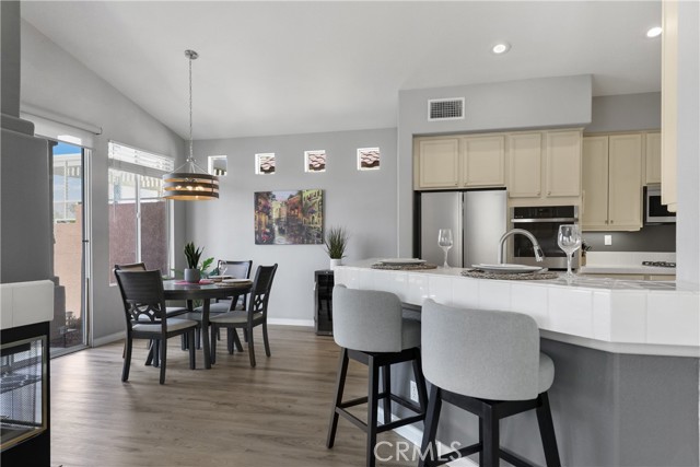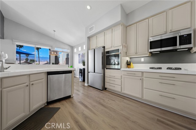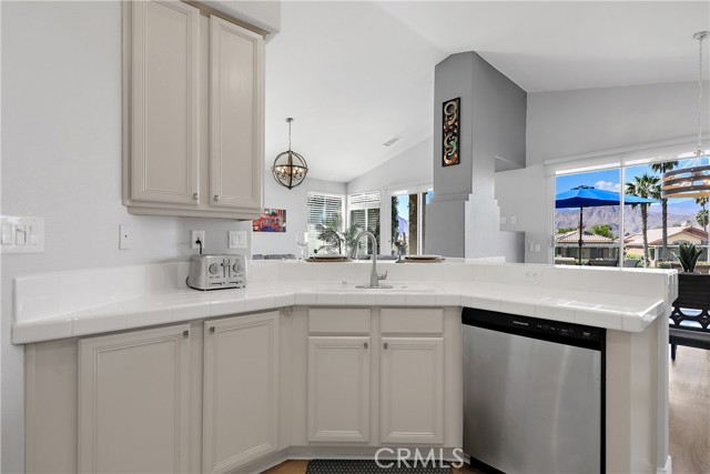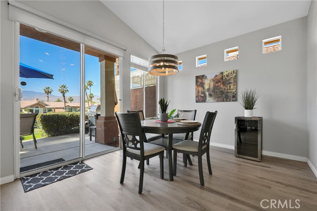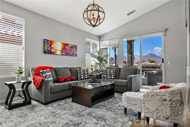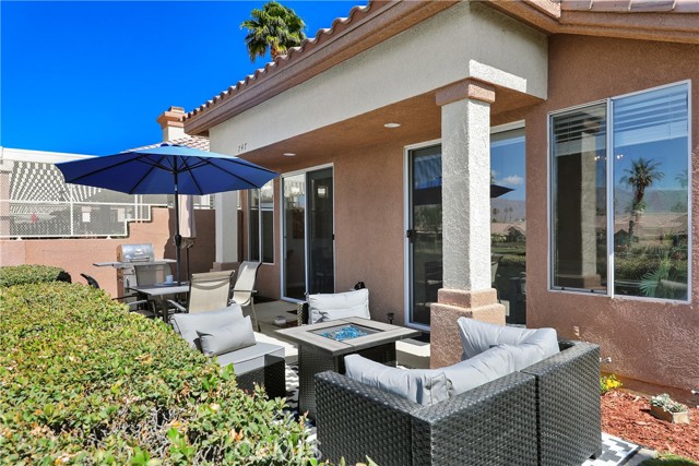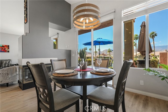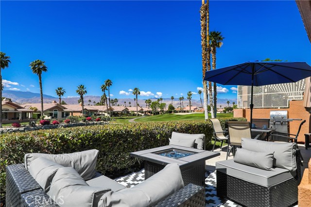 Beautifully positioned on the 4th hole within a guard-gated community, this fully furnished single-story residence offers exceptional mountain, golf course, and pond views. The home features a bright and open floor plan with large windows and sliding glass doors that provide natural light and direct access to the private patio, ideal for enjoying the surrounding scenery. The property is offered fully furnished and includes brand-new appliances throughout along with luxury vinyl flooring. The interior features 2 bedrooms and 2 bathrooms, a spacious living and dining area, high ceilings, and a three-sided fireplace. The primary suite includes an en-suite bathroom and walk-in closet. Additional features include an attached 2-car garage +golf cart garage space and a quiet cul-de-sac location. The outdoor patio overlooks the golf course and tranquil pond with panoramic mountain views beyond. Community amenities include pickleball, golf, country club, fitness center, meeting room, restaurant/bars, multiple pools and spas, greenbelts, and walking paths. Conveniently located near shopping, dining, golf, and the Indian Wells Tennis Garden.