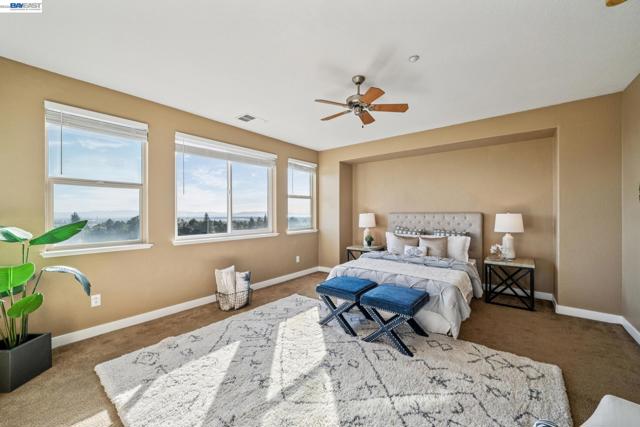 A sun-filled, south-facing residence in Monte Vista Villas (near Oakland Hills) with Bay views and a peaceful, private setting on end of cul-de-sac. 3-bedroom, 2.5-bath duet spans 2,291 sqft, featuring plush carpeting & tiles, a fireplace, and open layout designed for entertaining. 2 balconies.The gourmet kitchen feature granite countertops, stainless steel appliances, pantry, eat-over counter and complemented by a laundry room with a washer and dryer. 2 spacious primary suites & one bedrooms with balcony. The community offers multiple parks, scenic walking trails, a recreation center, fitness center, and a full-kitchen resident lounge. Conveniently located near a community college, Sequoyah Country Club, Oakland Zoo, and Chabot Space & Science Center, with easy access to HWY 580 and bus service (Route NX4) to the SF Financial District, this home provides the perfect combination of luxury living and a prime location.