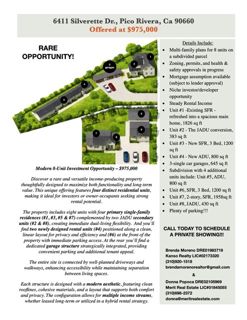 Rare Opportunity! This is a prime development opportunity with plans in progress located in Pico Rivera. The project includes completed architectural layouts and active permit applications with the city. Structural engineering is underway, providing a valuable head start for the next owner. Ideal for investors or builders looking to customize and complete a nearly shovel-ready project while approvals are still pending. By purchasing this property, a buyer bypasses at least a year of city planning, architectural design, and engineering hurdles. Skip the 12-month city wait and start building today! This massive 21,824 sq. ft. lot comes with architectural plans to transform the property into a high-income multi-unit compound. Whether you are an investor looking for a high-yield rental or a homeowner seeking a multi-generational estate, this project has it all. Unit 1 (The Remodel): An existing 2,208 sq. ft. Single Family Residence being refreshed into a spacious main home Unit 2 (The JADU): A savvy 383 sq. ft. Junior ADU conversion integrated into the existing structure Unit 3 (New ADU): A brand new, detached 1,200 sq. ft. Accessory Dwelling Unit featuring a 3-bedroom layout Unit 4 (New SFR #2): A completely new 800 sq. ft. second residence with its own private entrance Parking & Storage: Plans include a new 645 sq. ft., 3-car garage and a total of 4 onsite parking spaces Professional architectural plans from DG+Associates. This project is designed to the latest 2025 California Building Codes. Don't spend your time in city hall—spend it on the job site. This is a rare, low-risk, high-reward project in a sought-after neighborhood. Plan sets and permit status available upon request.
