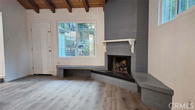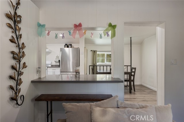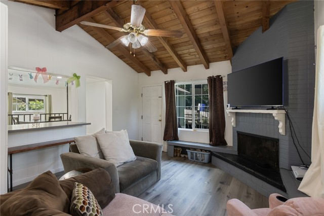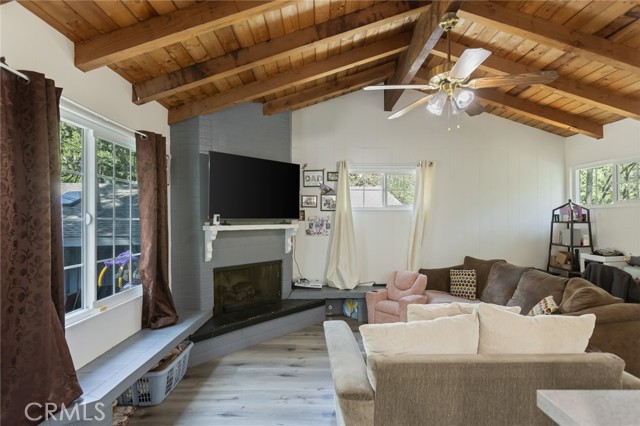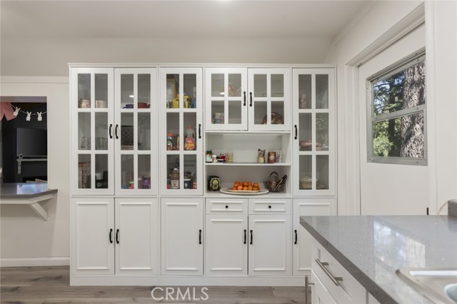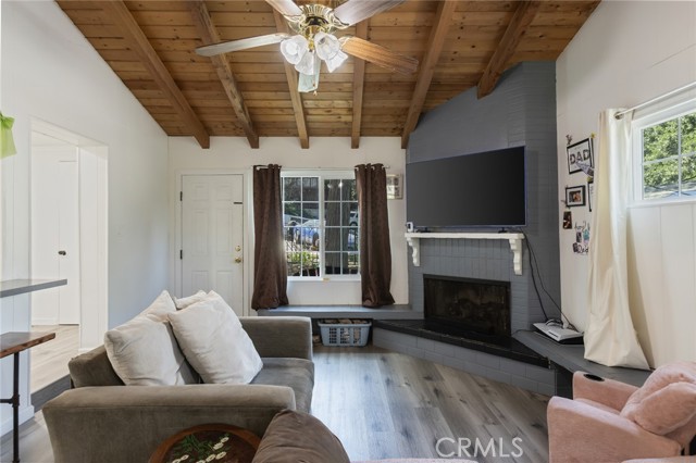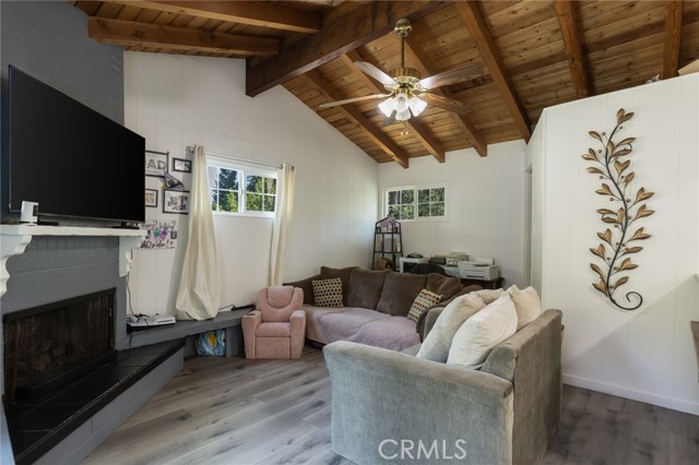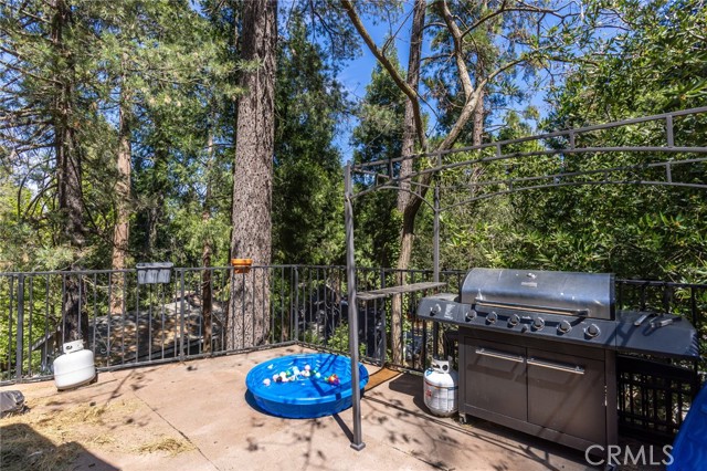 Welcome to this inviting mountain retreat, ideally located just minutes from Lake Gregory and Crestline Village. This updated 2-bedroom, 1.5-bath home offers a blend of comfort, functionality, and opportunity—perfect as a full-time residence, weekend getaway, or potential investment property. The main level has been thoughtfully renovated, featuring new subflooring and laminate flooring, along with a beautifully updated kitchen complete with modern cabinetry, updated appliances, and a charming built-in pantry. Just off the kitchen, a spacious deck invites outdoor dining, morning coffee, or relaxing in the fresh mountain air surrounded by mature pines. The main level bathroom has been upgraded with porcelain tile flooring, a tiled shower surround, new vanity, and toilet. Downstairs, a second living area and bedroom with direct access to the backyard provide added flexibility—ideal for guests, a home office, or extended living. Additional highlights include indoor laundry, multiple storage areas, and rare off-street parking for two vehicles, a valuable feature in this mountain setting. The home’s south-facing orientation enhances natural light and helps maintain comfortable temperatures year-round. Conveniently located near Lake Gregory, local shops, dining, and commuter access down the hill to San Bernardino, this home offers both lifestyle and versatility, with potential for part-time use or rental opportunities (buyer to verify local regulations).