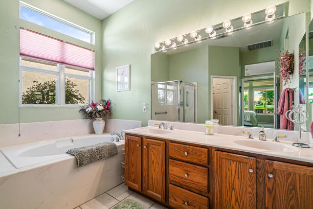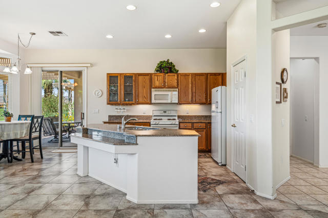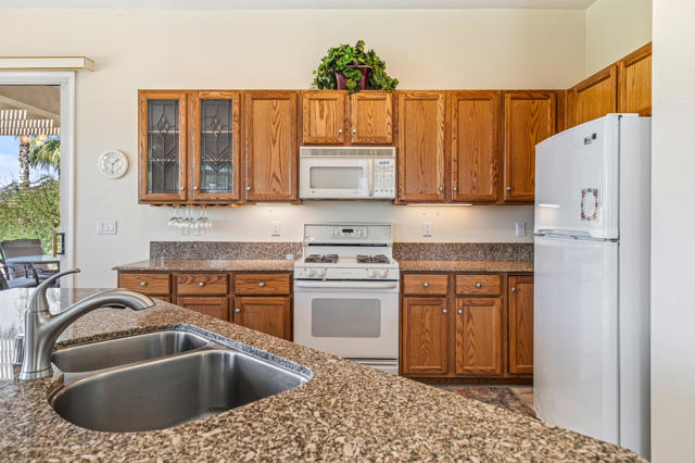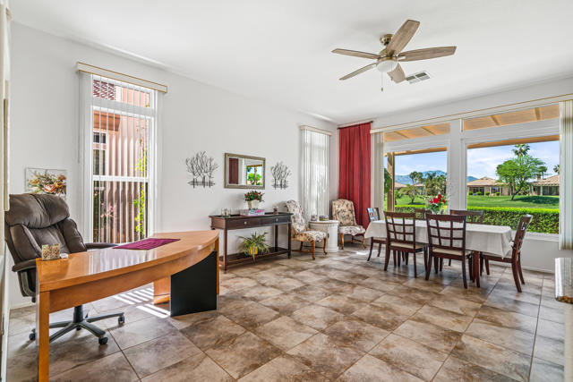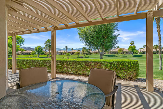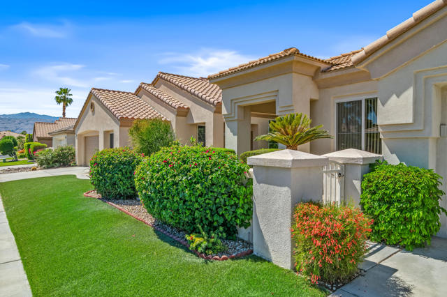 Fantastic Mountain, Fairway and Beautiful Sunset Views from this beautiful and popular 2061 sq.ft. home! Featuring 2 BDRMS PLUS a Den, granite slab kitchen counters an open design layout and being offered FURNISHED. The large primary bedroom has dual walk-in closets, dual vanities and custom window replacements. The guest bedroom was customized to the larger version and the dbl door den is being utilized as a 3rd bedroom. All of the fairway/mountain view windows have also been updated/replaced. Additional upgrades include an entry courtyard, both A/C units & the water heater have been replaced, artificial front yard turf,, Toto commodes and an extended aluminum rear patio cover also been added. Heritage Palms is a premier adult community featuring an 18 hole championship golf course, indoor & outdoor pools, pickleball & tennis courts, fitness center, grill room, card rooms, billiards room, social clubs & more.
