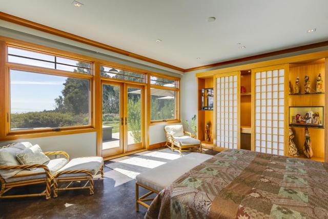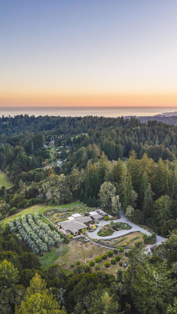 Behind a private gated entrance, this hilltop residence spans over 9.2 acres parcel with south facing ocean views stretching across Monterey Bay toward Moss Landing & Pacific Grove, creating a setting defined by privacy, open space, and natural beauty. Built in 2012, the single level main residence offers 3,314 sq ft with 3 bedrooms & 4 baths. Walls of glass open to south facing ocean view outdoor living spaces anchored by a gourmet kitchen w/8 burner Viking range, large island and professional grade appliances. Additional features include radiant heated floors, wood burning fireplace, metal roof, copper gutters, solar, whole house water filtration, and well water. An outdoor kitchen with BBQ, pizza oven, refrigerator, and entertaining area extends the living space. Olive and mixed fruit orchards, meditation garden, bocce court, and chicken coop enhance the land. The guest house provides 1 bed ,1 bath w/granite kitchen & bath finishes, hardwood floors, plus a 2 car garage w/a workshop and another full bath. Seller prefers to include the furnishings & artwork at an additional negotiated price, for a turnkey experience. Located approx 4 miles to Aptos Village & 5 miles to Rio Del Mar Beach you can truly get away from it all without compromise to location, access, or lifestyle.