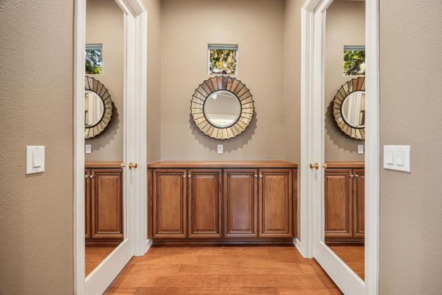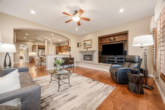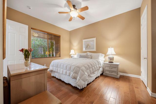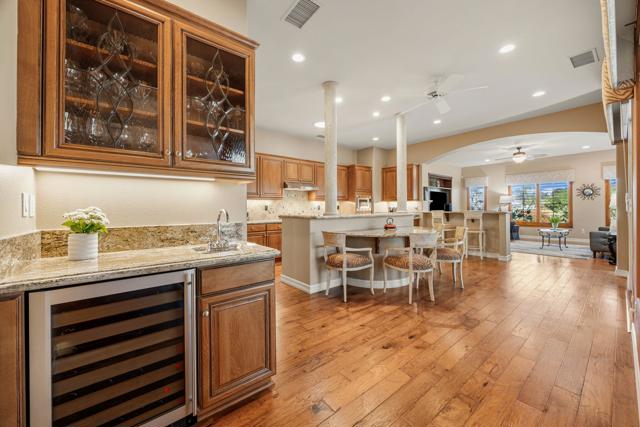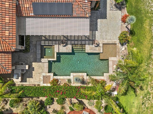 Experience elevated desert living in the exclusive Legacy enclave of Mission Hills Country Club. This beautifully spacious 3,106 square foot home offers an exceptional 3-bedroom, 4-bathroom floor plan with all bedrooms ensuite, there is great room, wet bar with wine refrigerator, plus a stylish powder room for guests--blending privacy with effortless entertaining. A private gated courtyard entry is accented by a brick driveway and walkway leading to the iron gate, creating a striking and welcoming first impression. As you enter, you are greeted by rich hickory wood flooring that runs throughout the home, creating a seamless sense of warmth and sophistication across the living and dining areas. The great room is a showstopper, featuring a fireplace flanked by custom built-ins, while custom window coverings and shutters throughout the entire home provide elegance, privacy, and light control. The kitchen is thoughtfully appointed with stainless steel appliances, including recently replaced double ovens and dishwasher, designed for both everyday ease and entertaining with style.The primary suite is a true retreat, offering a private sitting area, direct access to the pool and spa, dual walk-in closets with custom built-ins, and a luxurious bath with dual sinks, a soaking tub, and a walk-in shower--perfect for relaxation and everyday convenience.Step outside to your own private resort--featuring a recently renovated pool and spa, extended covered patio, and a built-in BBQ--all framed by lush, mature landscaping. Enjoy serene mountain and greenbelt views, creating a tranquil backdrop for both relaxation and entertaining under the desert sky. This home is as efficient as it is beautiful, showcasing an expanded owned solar system (approx. 51 panels) and a tankless water heater for modern, energy-conscious living. The epoxy-finished garage, complete with a split system for climate control, along with a two-car garage plus golf cart garage, adds both comfort and functionality. Offered furnished per inventory list, this home presents a seamless move-in opportunity or ideal desert retreat.Residents enjoy access to Social and Fitness Membership amenities, completing the full-service lifestyle synonymous with this premier community. A rare opportunity to own a meticulously upgraded home where luxury, comfort, and the best of desert living come together.
