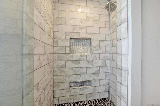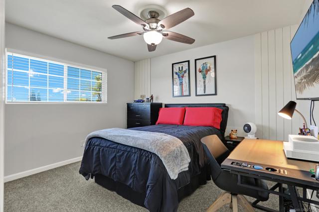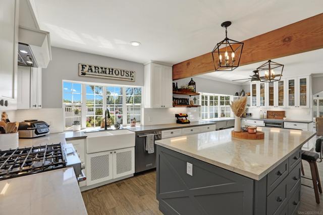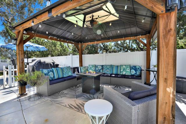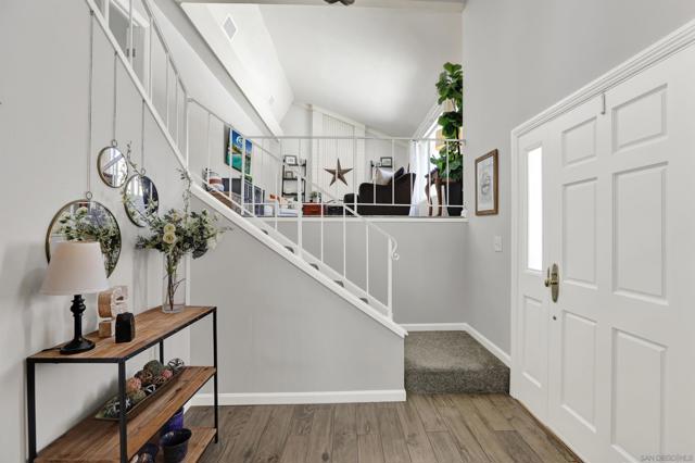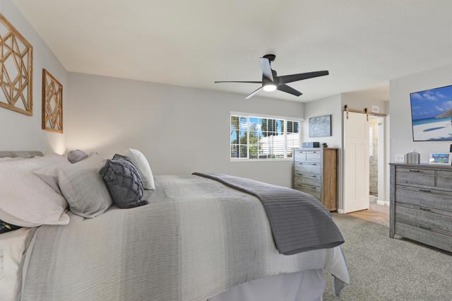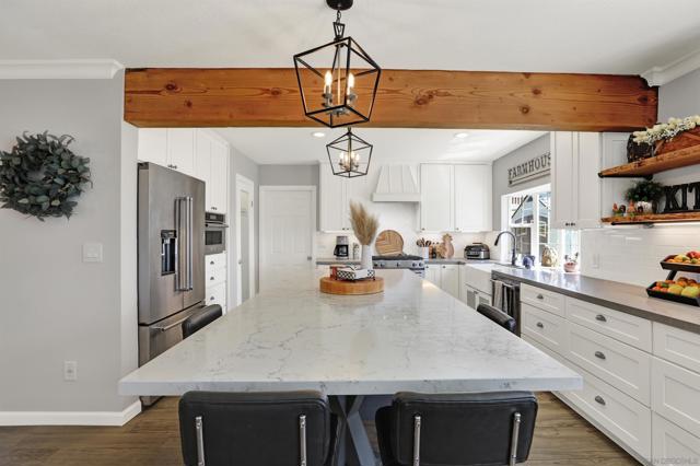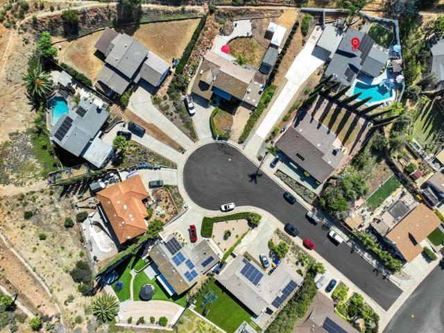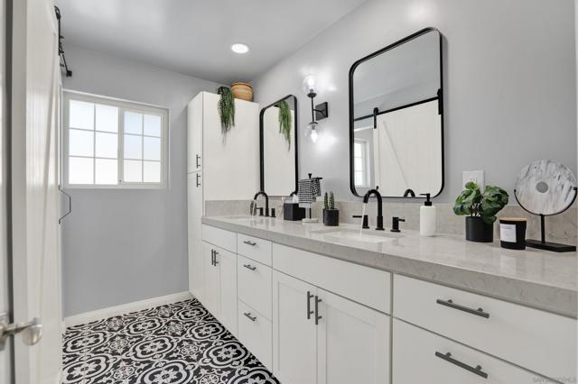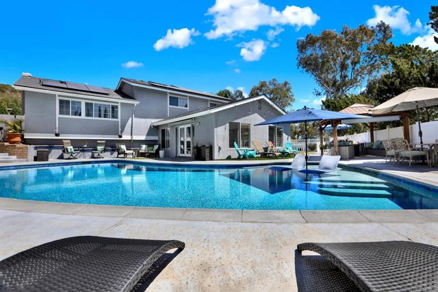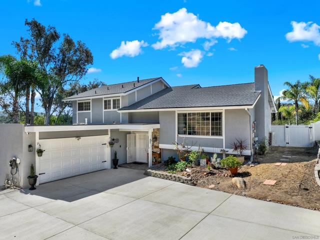 Exceptional Southwest Poway location in the highly sought-after Poway Portals neighborhood; set on a peaceful 1/3 acre, cul-de-sac lot. This inviting split-level home features a gorgeous “Farmhouse” kitchen w/huge island, ample storage and opens up to the 23’x23’ great room. Durable/easy-maintenance Tile flooring throughout the entire main level. The Primary Bedroom & spacious Living Room (at the mid-level) feature high ceilings, large picture windows bringing in abundant natural light, and a striking white brick fireplace. The Primary Bath has been updated w/herringbone tile floors, white cabinetry, mirrored triple closet doors, separate shower/toilet room w/Barn Door for privacy. The Upper-Level houses all three secondary bedrooms and Bathroom; featuring fun black & white tile floors, dual sinks, ample storage & another space-saving Barn Door. Additional upgrades include: Freshly painted interior & exterior, brand new concrete driveway, brand new HVAC System, Newer Roof & Fully PAID-FOR Solar, resurfaced (pebble-finish) Pool w/Baja Shelf, Newer Pool Equipment, Dual-Pane Windows, Whole House Fan, Ceiling fans in All Bedrooms & Family Room. The spacious backyard offers low-maintenance landscaping; Artificial Turf, raised planters w/drip irrigation, Vinyl Fencing, several entertaining areas; including a large Gazebo to escape the Sun. Ample parking; including room for your Boat and/or RV (w/clean-out). The Oversized, attached 2-car garage has room for a workshop/extra storage, etc. Laundry is located in the Garage. No HOA/No Mello Roos & within the award-winning Poway Unified School District. Save on Gas & enjoy ALL the benefits of Poway without the drive! Less than five miles from the I-15 FWY; close to shopping, parks, hiking & biking trails (Iola Trailhead), AND just 30-minutes to the Beach! There is SO MUCH to uncover in this spectacular home - come see for yourself!