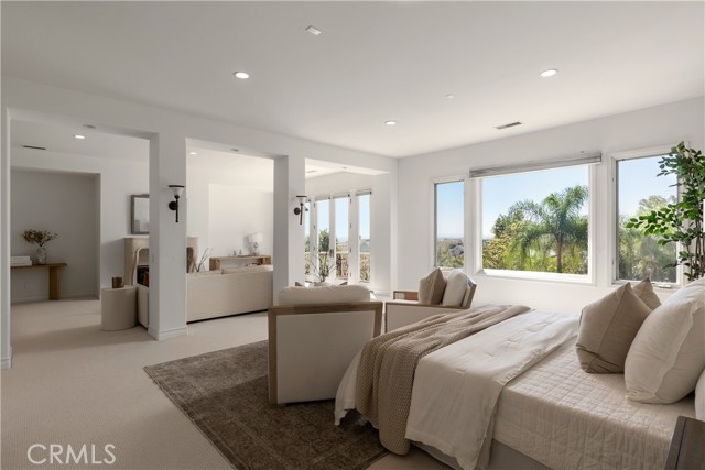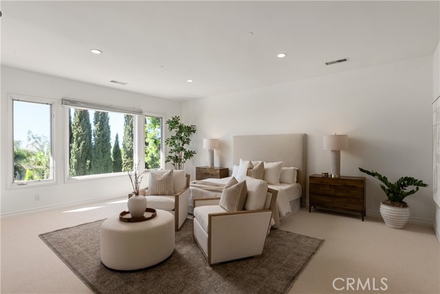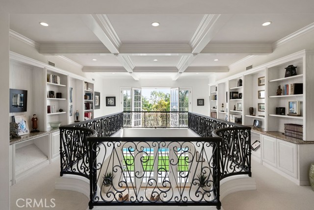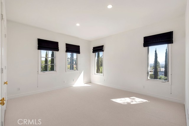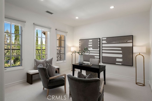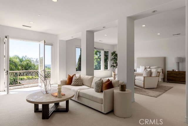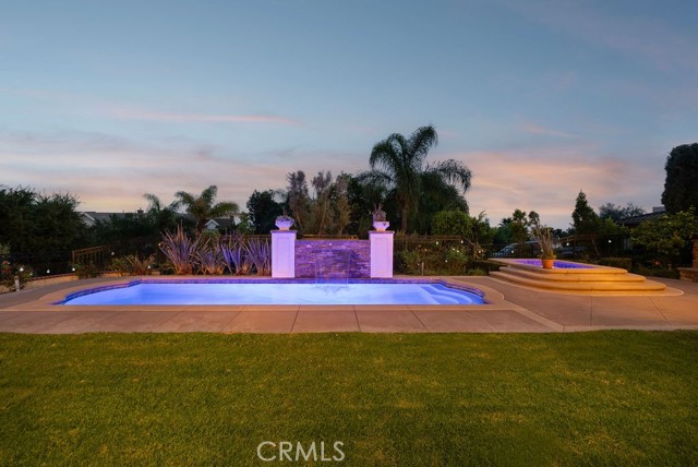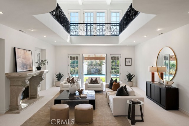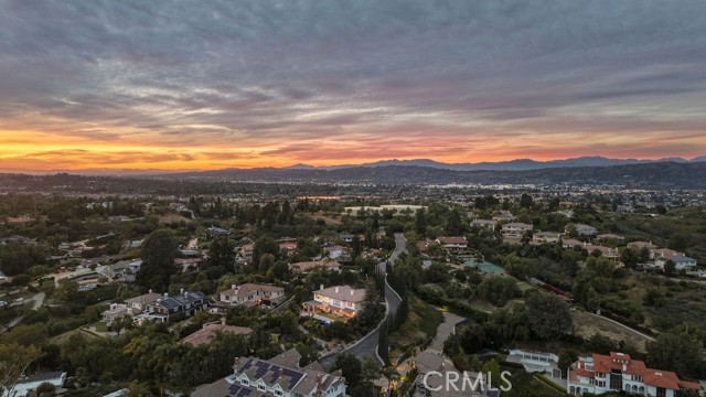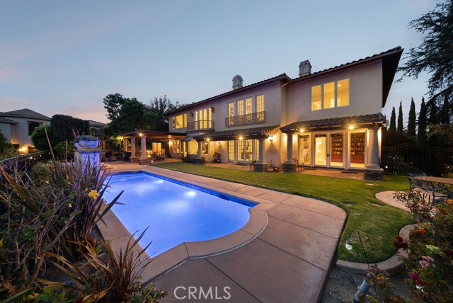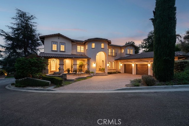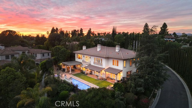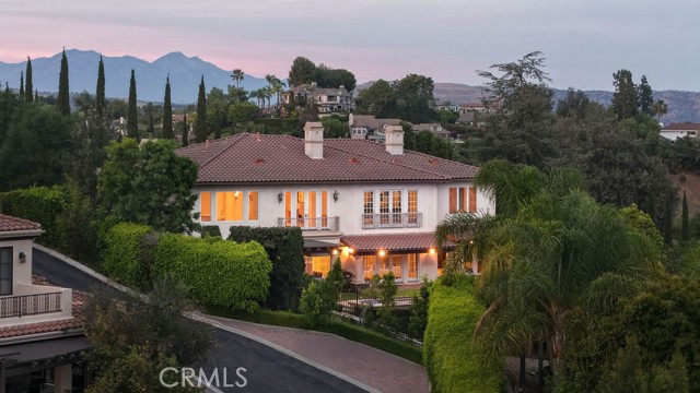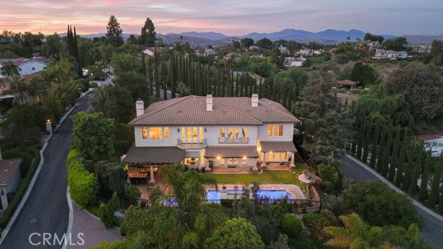 Tucked behind the gates of a quiet, private cul-de-sac, this extraordinary Mediterranean estate is a masterpiece of grandeur, seclusion, and architectural elegance. Over 6,600 SF set on more than half an acre, this is a true sanctuary designed for those who expect nothing less than exceptional. Soaring ceilings and an abundance of natural light create a breathtaking sense of scale and openness. The formal living room stuns with a dramatic two-story ceiling, a striking custom fireplace, and a captivating overlook from the upstairs library above. Dual glass doors beckon you into the bonus room providing a perfect private office sanctuary, media room or game room. French doors draw you outward to an awe-inspiring retreat, seamlessly blending indoor and outdoor living. The chef’s kitchen is both sophisticated and commanding—featuring granite countertops, Viking range, Sub-Zero refrigeration, dual dishwashers, wine fridge, and richly stained custom cabinetry. The adjoining oversized family room offers warmth and comfort with a built-in media center, perfect for both intimate evenings & lively gatherings. Main level offers two private bedroom suites, each with its own full bath, ideal for guests or multi-generational living. Upstairs reveals a stunning mezzanine complete with full library and gallery-style walls—an inspiring space to showcase art & treasured collections. The primary suite is simply spectacular, with sweeping views and private retreat with flexible sitting area, perfect for a nursery or gym. A two-sided fireplace adds ambiance and warmth, and a private balcony invites you to enjoy the panoramic vistas. The spa-inspired primary bath features a luxurious soaking tub set within its own elegant alcove, dual vanities, makeup station, and expansive walk-in closets. Two additional sizeable secondary bedrooms with their private baths also adorn the second level living area. Step outside to your own resort-caliber paradise. An impressive entertaining pavilion, complete with built-in BBQ, fireplace, sparkling pool & spa, and lush lawns framed by mature landscaping designed for unforgettable gatherings or relaxation. Perfectly positioned to capture breathtaking views of mountains & Catalina, the home’s exterior is equally captivating, with a paver driveway, covered porch, and a grand arched double-door entry. This is more than a home, it’s a statement of timeless luxury, offering an unparalleled sense of tranquility, beauty, and endless horizon.