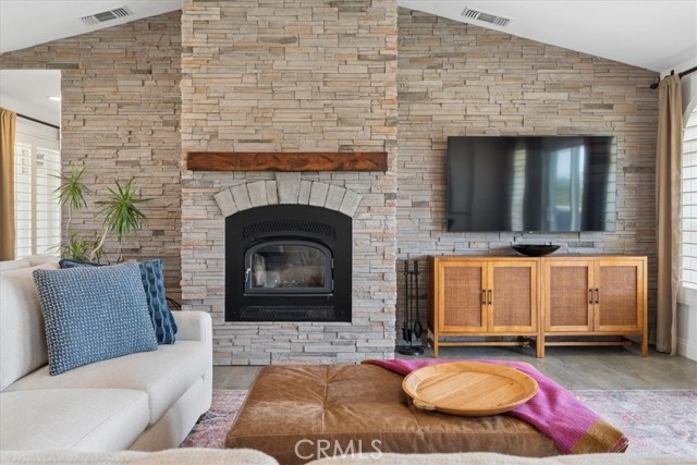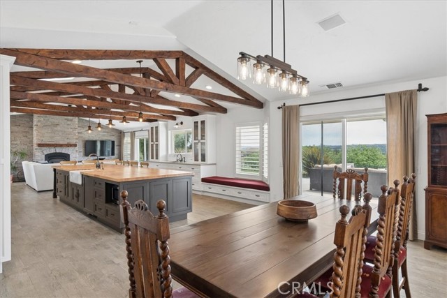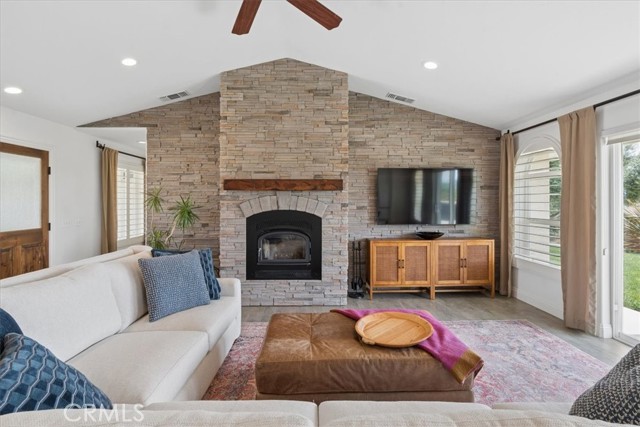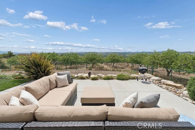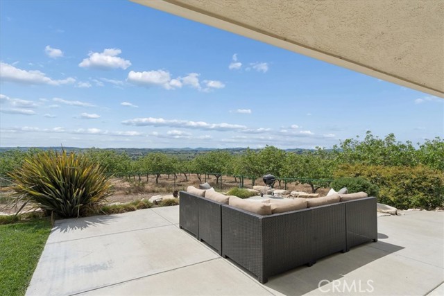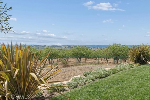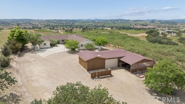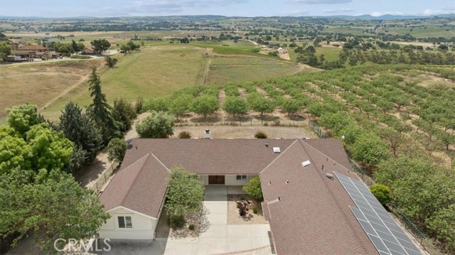 Stunning panoramic views and refined country living define this exceptional single-level estate on a picturesque 10+ acre hilltop parcel just minutes east of Paso Robles. The open-concept ranch-style home is designed for comfort and entertaining, with the living room, dining area, and kitchen flowing seamlessly together around a striking custom 20-foot island. The kitchen is further enhanced by a Viking range, while a wood-burning fireplace adds warmth and charm to the living room. Expansive windows frame the surrounding landscape and capture breathtaking views from nearly every room. The spacious floorplan includes three bedrooms, an office, bonus room, and large walk-in pantry/storage room. An attached three-car garage and substantial detached shop offer exceptional space for vehicles, equipment, hobbies, or agricultural use, with the shop featuring two roll-up doors, a large workroom, half bath, and walk-in cooler. Approximately six acres of mature organic pistachio trees create privacy and a beautiful setting. Owned solar, pipe fencing, and gated entry complete this remarkable Paso Robles area property.