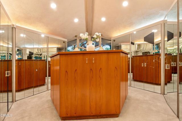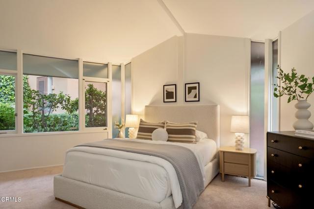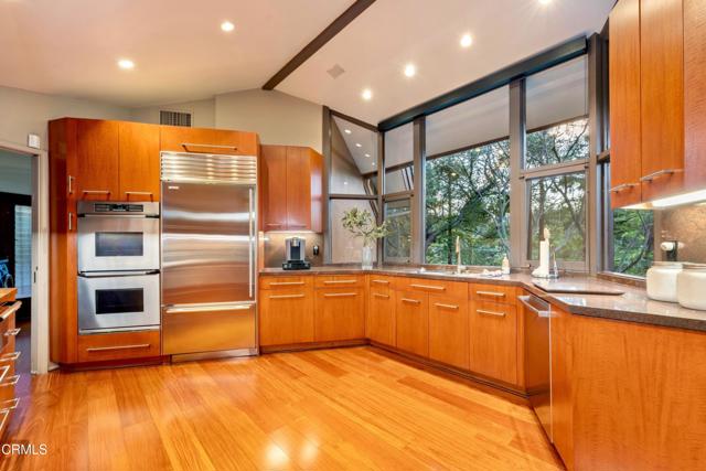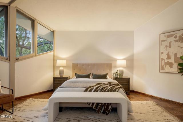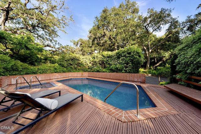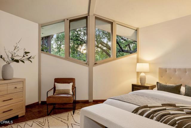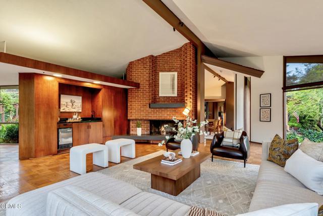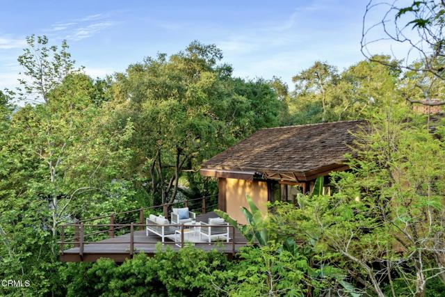 Tucked amid the treetops of Lacy Estates, this iconic 1953 Mid-century Modern home, designed by acclaimed architect Whitney R. Smith, AIA, is a masterclass in streamlined, organic shapes and indoor/outdoor integration. Situated on nearly an acre, the private, gated compound offers an enchanting escape with walls of floor-to-ceiling glass, framing a sweeping panorama toward the San Gabriel mountains. The private retreat boasts 3,768 square feet of refined living space, including 4 bedrooms, an office, and 4 baths. The dramatic living room with a 14 foot high ceiling features access to a wraparound wood deck, brick fireplace and an elegant wet bar ideal for crafting the perfect martini. The gourmet kitchen is a modernist's dream, updated with high-end stainless steel appliances and treetop vistas, while the adjacent light-filled breakfast area showcases the front courtyard. Practicality is discreetly handled with a separate laundry area off the kitchen, featuring ample counter space and a sink. The fourth bedroom and bathroom, ideal for guests, is adjacent to the laundry area. The main living area is separated from the private bedrooms by a glass-enclosed hallway - a cinematic bridge rising over a flowing babbling brook and stone-encased pond. The primary suite features a generous 300 sq ft walk-in closet and an ensuite full bathroom bathed in natural light from the geometric skylights above. There are two adjacent bedrooms and baths plus a private cozy office. Outside, the lush, spectacular landscaping features mature oak trees, expansive decks for entertaining, and a unique hexagon-shaped pool and spa. A brick walkway, shaded by mature vines, leads to the front door, while a unique, impressive light fixture--a gift to the former owner from Chiang Kai-Shek--adorns a front yard oak. Gated, with up to 12 parking spaces and a two-car garage with an additional bonus room and 3/4 bath, this iconic, private sanctuary feels worlds away, yet is minutes from Pasadena and Los Angeles. Filled with clean lines and stream-lined organic shapes, this tailored, elegant, modernist home is aspirational living defined.