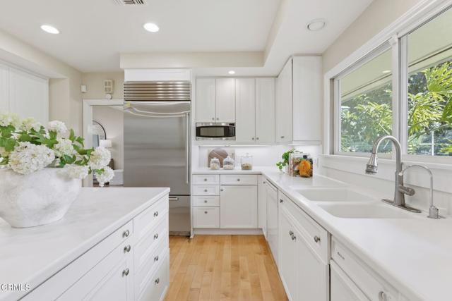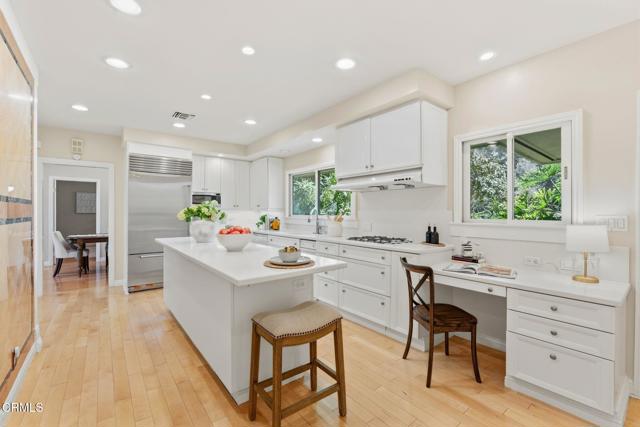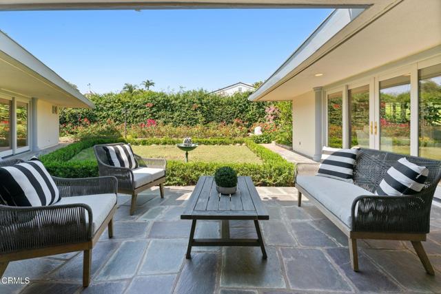 Resting on a 1/2 acre corner lot in San Marino's exclusive Huntington Library neighborhood, 685 Chester Avenue is a timeless Mid-Century ranch ideal for planting roots. This single-story home offers elegant, light-filled living spaces, a private backyard with lush gardens, and a versatile 824 sq ft guest house complete with a full kitchen, living room, and bedroom ensuite. A grand, double-door entry opens to the home's gracious foyer with gleaming marble tiles. To the right, an elegant formal living room with intricate millwork and numerous windows offers the perfect setting for social club meetings, piano practice, or simply relaxing with a good book in front of the handsome fireplace. The heart of the home is found in the centrally located family room complete with skylights and a statement fireplace. Sliding glass doors dissolve the boundary between inside and out while offering peaceful views of the covered patio and lush gardens. Nearby, the kitchen features a large island, abundant storage, and a Sub-Zero refrigerator. From the living area, a hallway leads to three bedroom suites resting at the rear of the home, including the luxurious primary. A private fourth bedroom and a hallway bathroom are located off the foyer. The home's serene outdoor areas include a covered stone patio-ideal for weekend brunch-overlooking a grassy lawn and blooming rose garden. The secluded guest house at the rear of the property is updated and fully equipped for visiting loved ones or multi-generational living. Between the garage and the rear gate, you'll find a large and versatile space ideal for extra parking or a basketball court. Set in a picture-perfect neighborhood just blocks from the Huntington Library and San Marino High School, 685 Chester Ave is where the good life stops being an aspiration and becomes reality.