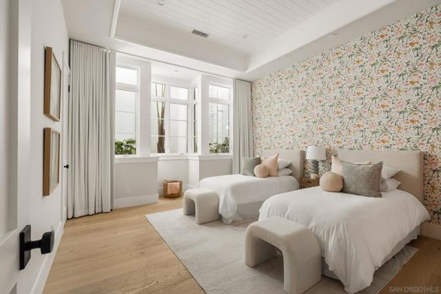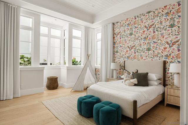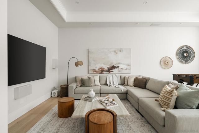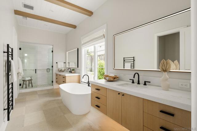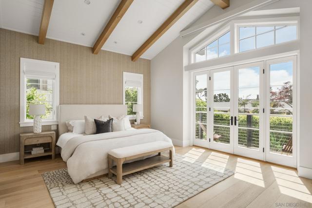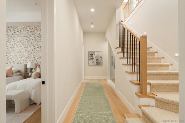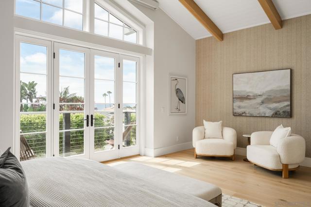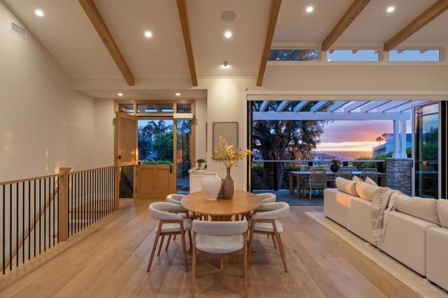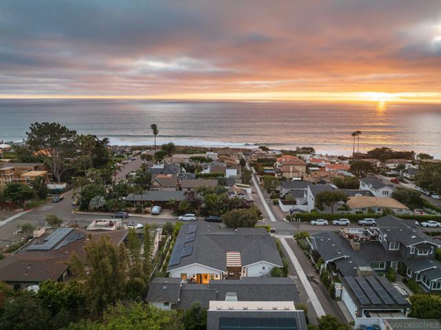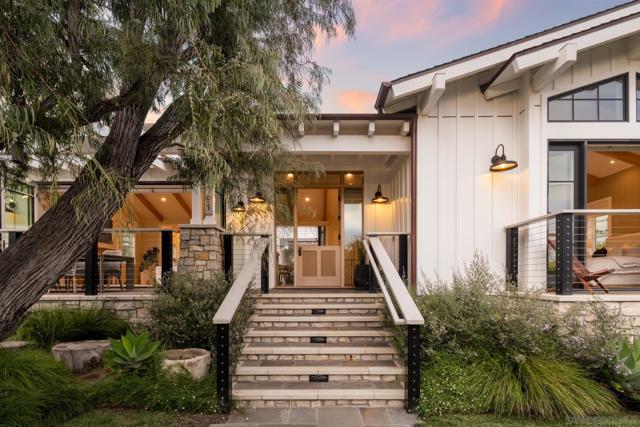 Set in Olde Del Mar just blocks from the beach, shops, and restaurants, this beautiful ocean-view home offers an exceptional coastal lifestyle. Built in 2022, the open 4-bedroom floor plan centers around an inviting great room with vaulted ceiling and retractable glass doors that open to an expansive porch, creating a seamless indoor-outdoor setting for sunset views. The chef’s kitchen features a generously sized island with marble countertops and luxury Miele 6-burner range with grill and double ovens. Two bedrooms are located on the main level, including a luxurious primary suite with balcony and spa-like bath. On the lower level, thoughtfully designed light wells and high ceilings enhance the bright, airy feel of the two additional bedrooms and bonus room. A detached ADU, hot tub, built-in BBQ, and covered outdoor living area with fireplace create an ideal setting for entertaining. Complete with paid solar and a 2-car garage with EV charger, this stunning residence presents a rare opportunity to own a newer build in a highly sought-after location west of the 101.