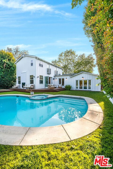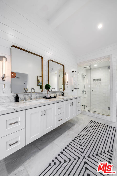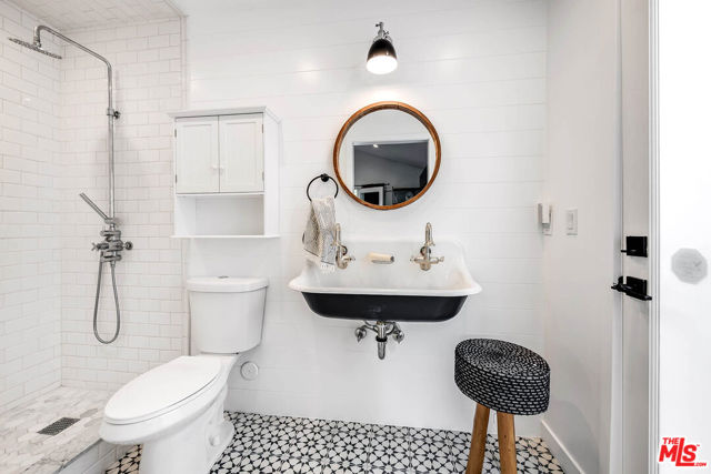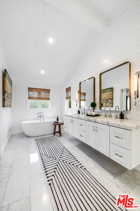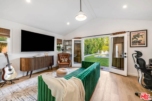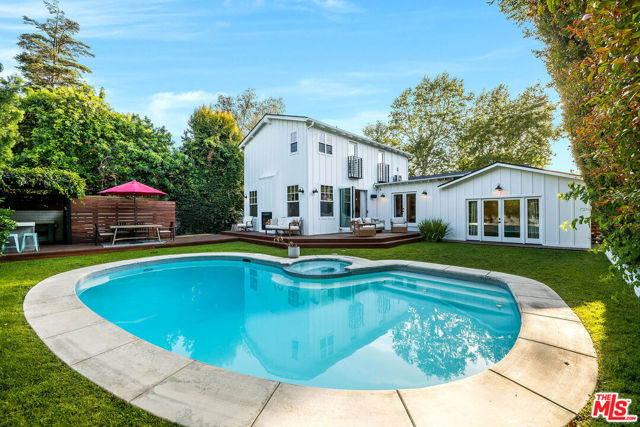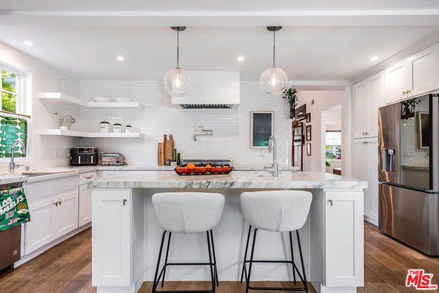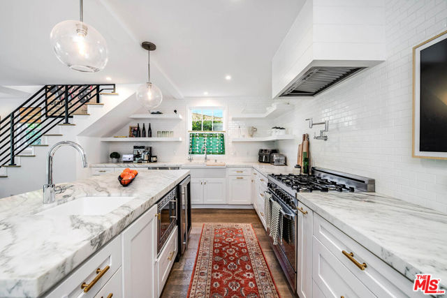 Luxurious Modern Farmhouse. Upgraded & updated! Hardwood floors, open floorplan. Spacious living room w/soaring ceilings, marble fireplace & dining area. Cozy window seat w/storage below. Sleek kitchen w/Bertazzoni range, pot filler, KitchenAid refrigerator & dishwasher, farmhouse sink. Island w/prep sink, beverage/wine refrigerator, microwave. Marble countertops, subway tile backsplashes. Brass knobs in kitchen & guesthouse. Great room w/La Cantina doors & indoor/outdoor fireplace! Resort-size pool/spa. Barn doors in master, generous closet space, marble vanities & floors, freestanding tub, shower, glass doors to Juliette balconies. Laundry w/utility sink. 1st floor guest room w/French doors to pool. Guesthouse entered from backyard or garage w/kitchenette, marble counters & breakfast bar; bath w/double vanity, geometric tile floor, shower. Wired for NEST system: heating/cooling, alarm, doorbell & outdoor cameras. Near shops, restaurants and studios!