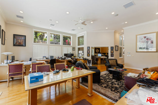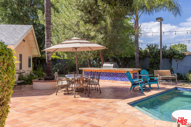 Nestled south of the boulevard on the boarder of Woodland Hills and Tarzana, 19717 Wells Dr presents a rare opportunity on a sprawling, flat half-acre corner lot. First time on the market in over 30 years, this single-story property is perfect for an end user looking to personalize with light updates or a developer seeking a premier lot in a coveted location. Inside, a thoughtfully designed floor plan offers multiple living and entertaining spaces. The entry opens to a formal living room with a fireplace and nearby powder room, flowing into the formal dining room. The dining area connects to the kitchen, complete with an eat-in area and built-in cabinetry for everyday functionality. Just beyond, an oversized family room sits at the heart of the home, featuring a built-in bar, sunroom, and additional lounge area with a built-in entertainment center, all enhanced by natural light and generous space for gathering and entertaining. Past the family room is a fully permitted addition that forms its own private wing. Filled with natural light, this versatile, open space currently functions as a complete office suite, including two additional rooms used as a break room and conference room. At the back of this wing is an additional oversized bedroom with an en-suite bathroom and sliding glass doors providing direct outdoor access, making it ideal for guests, extended family, or a live-work setup. On the opposite side of the home are the main sleeping quarters, featuring 3 secondary bedrooms, a full hallway bathroom, and the spacious primary suite with its own en-suite bathroom. Outside, the backyard offers endless possibilities and exceptional amenities. Highlights include a detached pool house with a full bathroom and bar, pool and spa, full outdoor kitchen, half basketball court, putting green, and expansive flat lawn space - perfect for entertaining, recreation, or future expansion. With its rare half-acre flat lot, single-story layout, corner positioning, and flexible living spaces, this property presents a unique opportunity to create a dream estate.