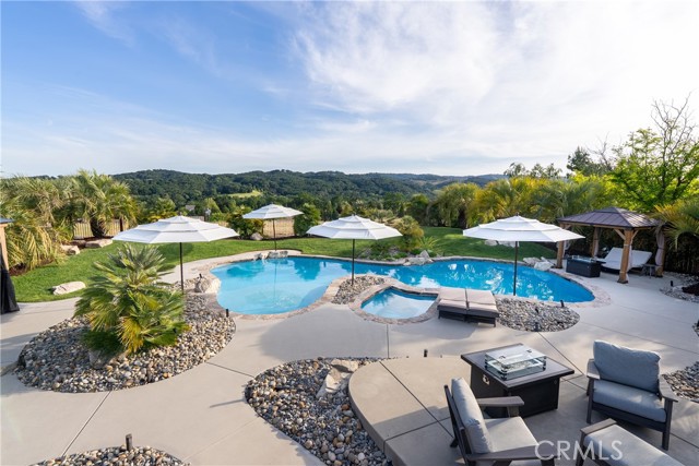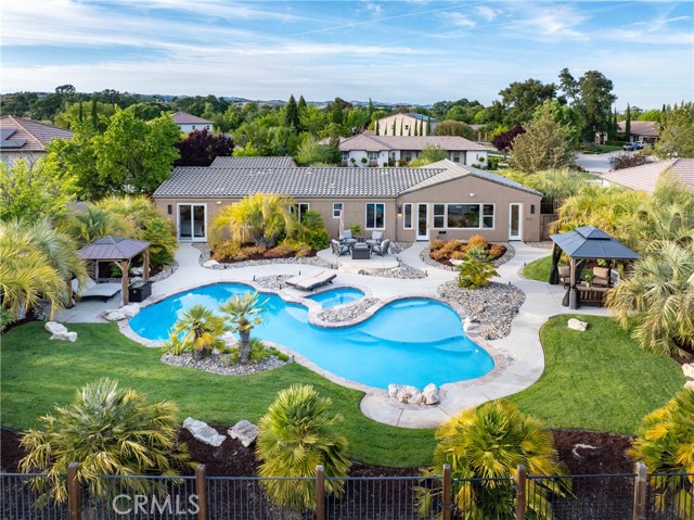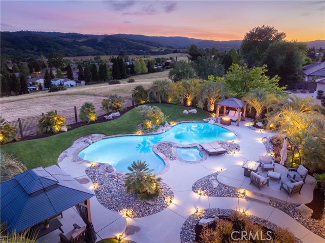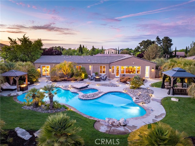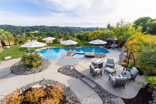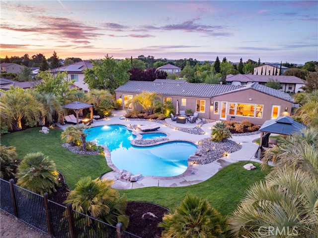 Located in one of Templeton’s most sought-after neighborhoods, The Vineyards, this stunning single-level home offers a resort-style backyard and a tastefully updated interior. Expansive windows look out onto the picture-perfect backyard, framing breathtaking views of Santa Rita ridge. A freeform pool and spa anchor the outdoor space, surrounded by lush landscaping, ambient lighting, and multiple seating areas, including covered gazebos with heaters and misters. Enjoy warm summer days by the pool and cool autumn nights beside sleek fire tables—just imagine stargazing from this luxurious backyard. The open-concept kitchen captures views of the backyard and surrounding hills, flowing effortlessly for both entertaining and everyday living. With nearly new KitchenAid appliances, including a 6-burner stove and double oven, any chef will feel right at home. The laundry room includes its own sink, backyard access, and nearly new Speed Queen washer and dryer. A newer HVAC system services the home, while a separate mini-split system conditions the detached garage. The home has been meticulously cared for, with many upgrades completed in recent years. Recently updated engineered bamboo flooring offers rich color and pairs beautifully with the wood shutters. Recessed lighting has been added throughout and can be adjusted to set the mood. The primary suite features a large soaking tub, low-curb shower, and an expansive closet. Don’t miss the private garden area along the side of the home, featuring three cedar greenhouses and double swinging gates for convenient driveway access. This home is designed for both entertaining and everyday enjoyment. Whether you’re watching the game on the 98" TV, hosting a lively pool party, or enjoying an elegant dinner with friends, the layout adapts to your lifestyle. Schedule your tour today. (All patio furniture may be included with an acceptable offer.)