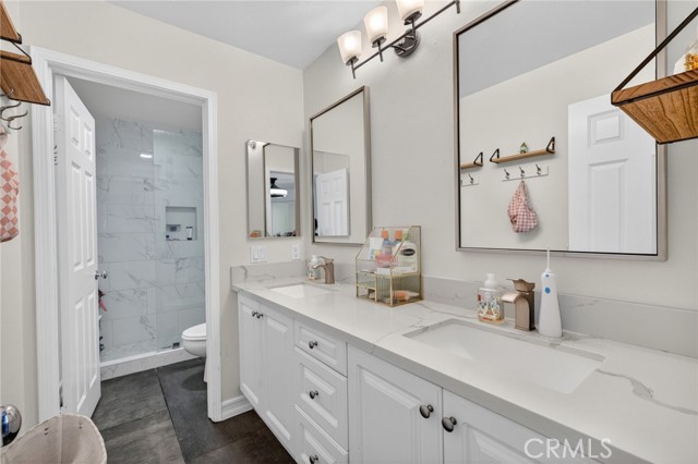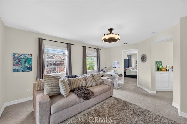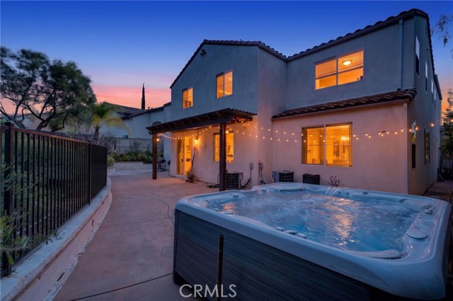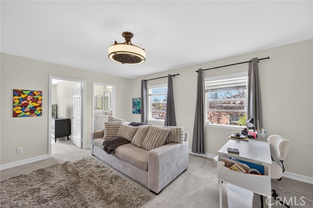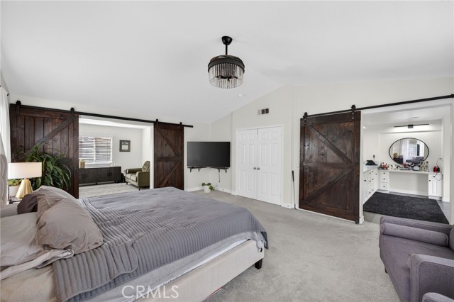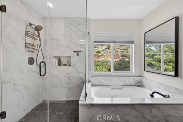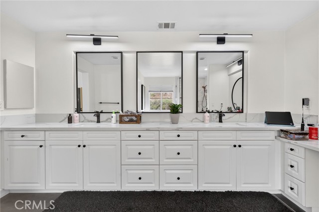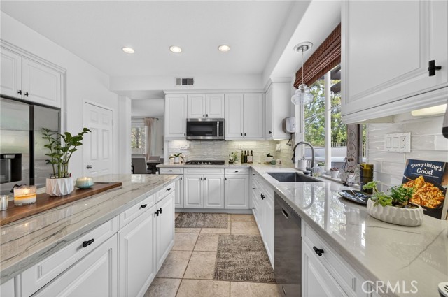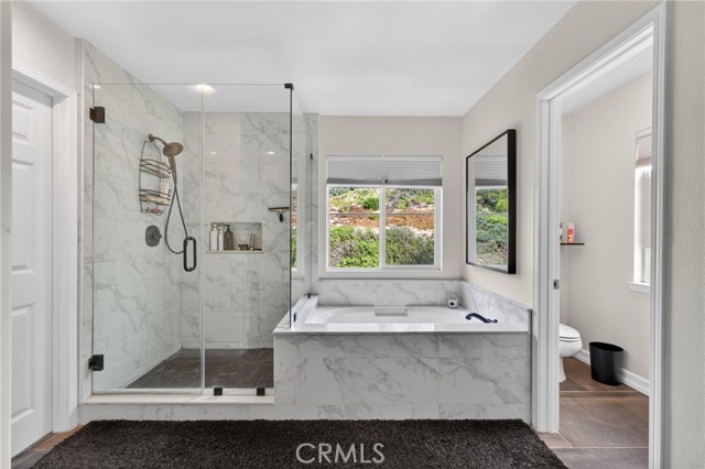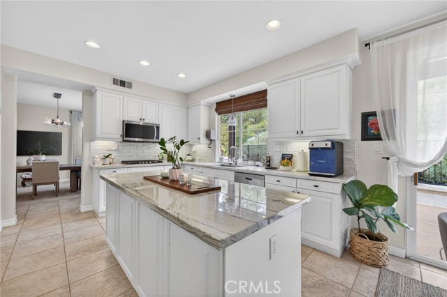 Welcome to The Fairways at Redhawk, Temecula's premier gated golf course community. This 4-bedroom, 3-bath home offers 3,545 square feet of bright, thoughtfully designed living space with neutral finishes and upgraded touches throughout. The remodeled kitchen features white raised-panel cabinetry, a large center island with dramatic stone countertops, gas cooktop, double oven, stainless steel appliances, and subway tile backsplash. A bright breakfast nook opens to the backyard through a sliding glass door and flows into the family room, making it a comfortable space for everyday living and entertaining. The master suite is a true retreat. Vaulted ceilings and dual barn doors set the tone, with one opening to a private attached office and the other to a fully remodeled spa-style bath. The ensuite features dual vanities with stone countertops, a dedicated makeup vanity, frameless glass walk-in shower with floor-to-ceiling marble tile, a soaking tub with marble surround, and a spacious walk-in closet. Black hardware and designer lighting complete the look. The flexible floor plan also includes a main-level bedroom and full bath, ideal for guests or multigenerational living, plus three additional bedrooms upstairs and a large bonus room ready to serve as a media room, playroom, or gym. Step outside and unwind in your own private oasis, complete with an above-ground jacuzzi spa, perfect for Southern California evenings after a round on the course. Families will love the award-winning schools serving this neighborhood, consistently ranked among the best in Riverside County. A split 3-car garage includes a detached single bay that works equally well as a home office, gym, or extra storage. Just off Redhawk Parkway with easy access to the 79, you're minutes from shopping, dining, wine country, and everything South Temecula has to offer.