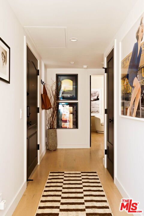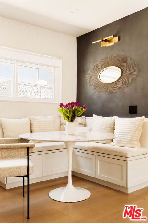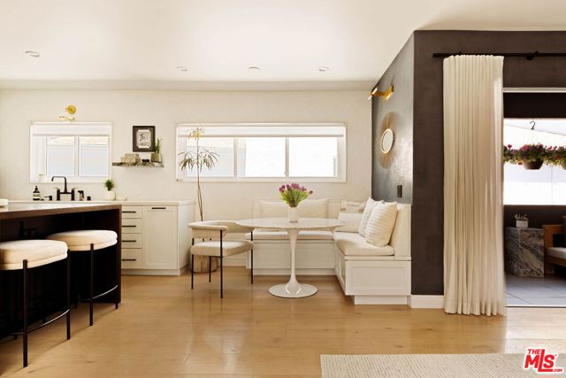 A remarkable top-floor designer-remodeled penthouse in one of Santa Monica's most sought-after neighborhoods, just moments from the beach, the Santa Monica Stairs, Montana Avenue shops, Palisades Park, and more. Fully remodeled and curated by the current owner for her own use, this exceptional residence reflects a level of detail and finish typically reserved only for multi-million-dollar homes. A formal entry leads to an open-concept floor plan with a sleek gourmet kitchen featuring custom cabinetry, top-of-the-line appliances including a chef's gas range and oven, built-in steam oven, microwave, and wine fridge, plus custom brass and glass shelving, a honed marble backsplash, and a granite waterfall island with breakfast bar and extra storage. The kitchen flows seamlessly into a built-in dining nook, spacious living room, and balcony made for lounging. The luxe, spa-like bathroom is richly finished with a floating oak vanity, double shower heads, jacuzzi tub, designer mosaic tile, and high-end fixtures and hardware. The oversized bedroom offers space for a king-sized bed, plus space for a home office, exercise, or sitting area. Additional upgrades include new windows with motorized shades, new lighting, new electrical panel, wide-plank Italian oak floors, custom oak interior doors and molding, air conditioning, and in-unit laundry. Larger than many two-bedroom units, this top floor, one-bedroom condo is flooded with natural light from multiple exposures. Set within a coveted and secure building, the property also enjoys lush landscaping, a panoramic rooftop deck, one secure parking space, and extra storage. HOA dues are $690 per month and include water, sewer, trash and earthquake insurance. Nothing short of spectacular!