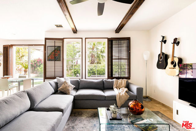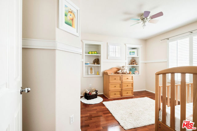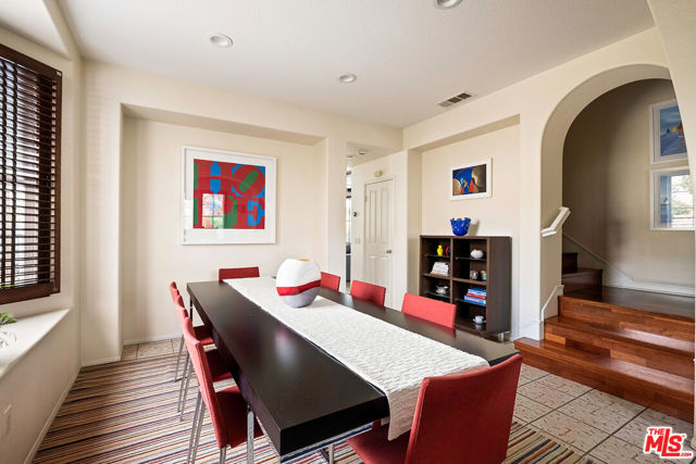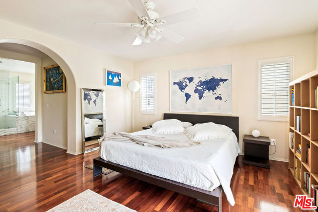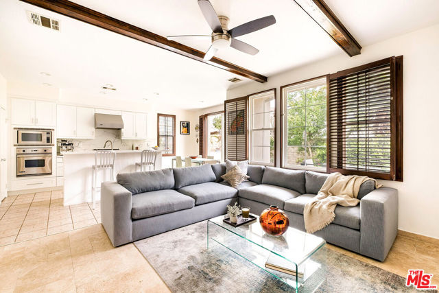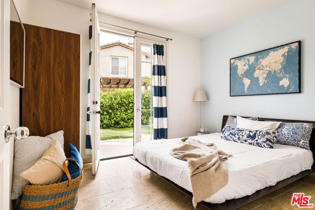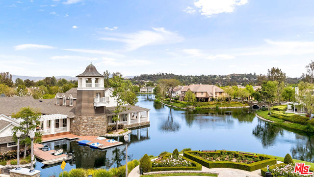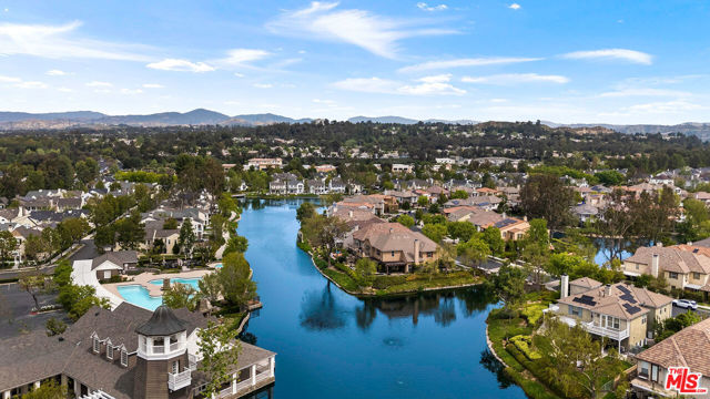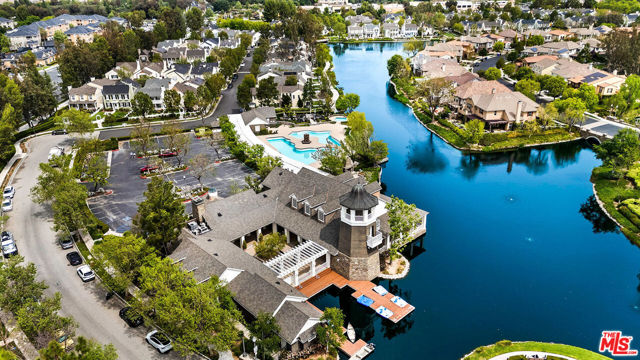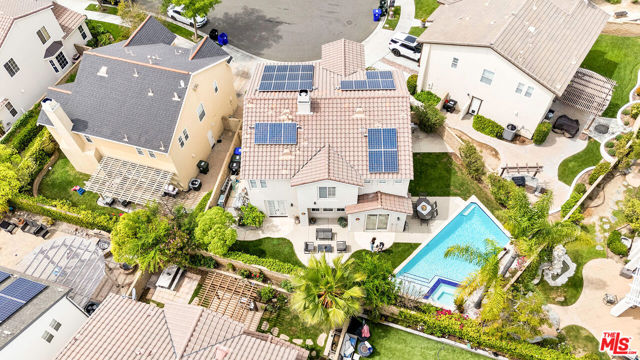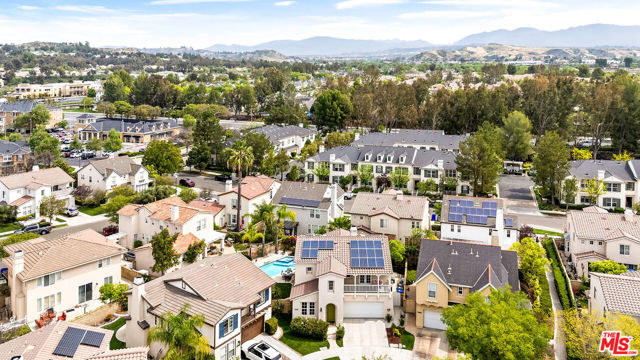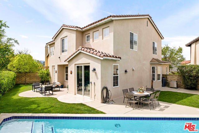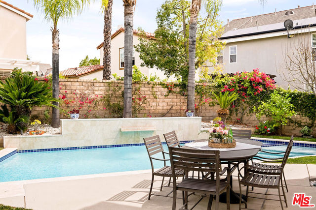 Welcome to this stunning Valencia Bridgeport residence, tucked away on a quiet cul-de-sac with beautiful curb appeal and a rare private pool a true standout in the neighborhood. From the moment you walk in, a graceful arched entryway and timeless architectural details create an immediate sense of warmth and sophistication. Inside, the bright and airy layout is thoughtfully designed to balance everyday comfort with effortless entertaining. The entry opens to a sun-filled formal dining area, where an interior arch adds depth and character, creating an inviting setting for both intimate dinners and lively gatherings. At the heart of the home, the gourmet kitchen impresses with top-of-the-line appliances, sleek cabinetry, quartz countertops, and a stunning central island with seating. With additional space for a casual dining table and direct access to the backyard, it seamlessly blends functionality and lifestyle, creating an ideal flow for indoor-outdoor living. The living room is filled with natural light and anchored by a travertine-accented fireplace and soaring wood-beam ceilings, offering a warm and welcoming space to relax or entertain. The main level is completed by a guest bedroom with direct backyard access, along with a well-appointed bathroom featuring a modern glass-enclosed shower with mosaic accents. Upstairs, rich hardwood floors add warmth and continuity throughout. The primary suite is a true retreat, generously sized and designed for comfort. A private balcony overlooking the quiet residential street provides the perfect setting for morning coffee or evening unwinding. The spa-like primary bathroom features a dual vanity, a deep soaking tub, a separate shower with beautiful tile work, and dual walk-in closets that balance functionality and luxury. Two additional bedrooms offer flexibility for family or guests and are complemented by a secondary bathroom with a dual vanity, modern finishes, and a standalone shower. A versatile bonus space further enhances the home's functionality, ideal for a home office, playroom, or additional living area. Step outside to your private resort-style backyard. The sparkling pool and spa are surrounded by a lush green lawn, mature palm trees, manicured landscaping, and multiple seating and lounge areas perfect for Southern California outdoor living at its finest. Additional highlights include plantation shutters throughout, a dedicated laundry room, central heating and air conditioning, Tesla solar panels with 8,500+ kWh guaranteed annually, a 240V EV charger outlet, and a spacious two-car garage. Ideally located just moments from Bridgeport Lake, scenic waterways, the community pool, spa, and clubhouse, as well as the area's top dining, grocery, and shopping destinations. Come experience the incredible lifestyle this exceptional home has to offer.