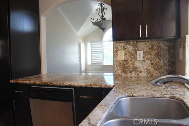 Welcome to Altisse in Aliso Viejo. This is an upper level one story 2-bedroom 2 bath View Condo with a direct access garage. You will enjoy the evening sunsets and panoramic views from the living room, primary suite or the walk-out balcony. Spacious living room with tall-vaulted ceilings, abundant natural light and a fireplace finished with stacked stone. The kitchen has warm tone cabinets with upgraded granite counters and backsplashes and 12X24 tiled floors. Stainless gas stove, built in dishwasher and microwave. The dining area also includes option for breakfast bar seating. Wooden Plantation Shutters throughout, Crown Moldings and tall baseboards. Added recessed lighting. The primary bedroom has a large walk-in closet, tall vaulted ceilings and a large patio door. The primary en-suite bath includes dual vanities and a remodeled walk-in shower with glass enclosure. Conveniently located Inside laundry room with gas or electric dryer options. Direct access garage with EV charge port. The walls and ceilings enjoy a warm two tone paint palate. This is a great community with large swimming pool and spa. Near Aliso Viejo Town center with lots of dining and shopping opportunities. Plenty of biking and hiking trails and award-winning schools are nearby. Easy access to transportation corridors including freeways, toll-roads for convenient transportation. The Aliso Viejo Master Association includes pools, spas, parks, clubhouse, tennis and basketball courts, and many other wonderful amenities with community planned events for all ages.