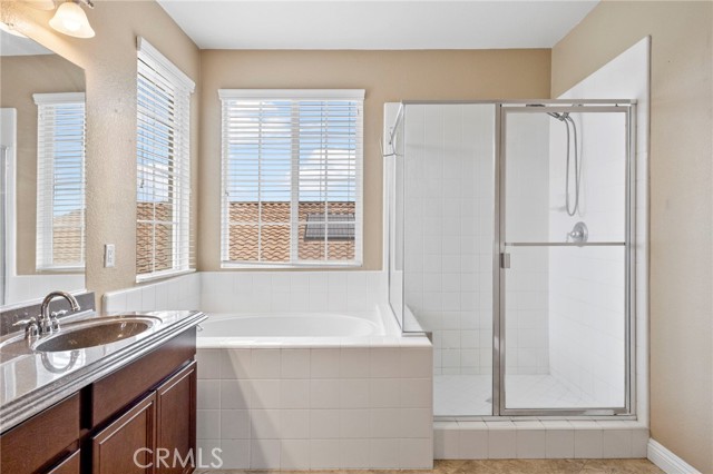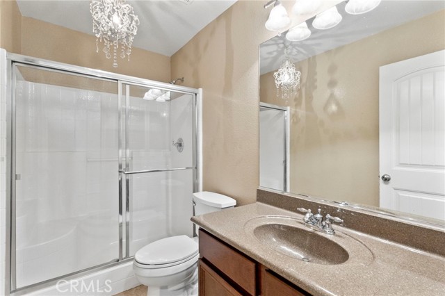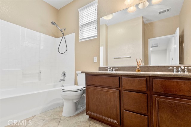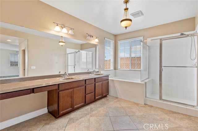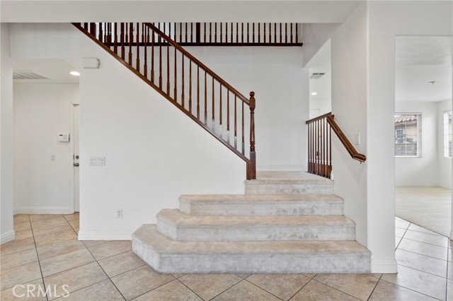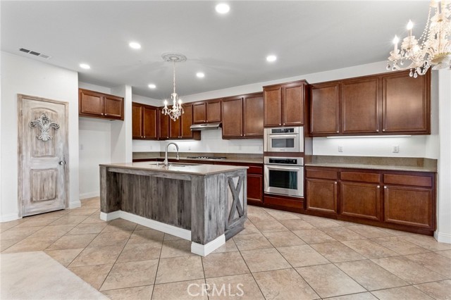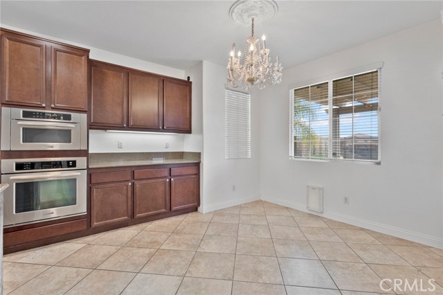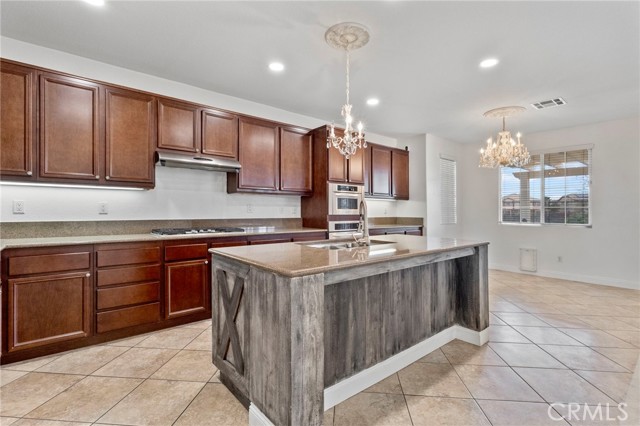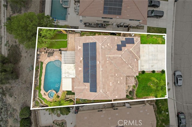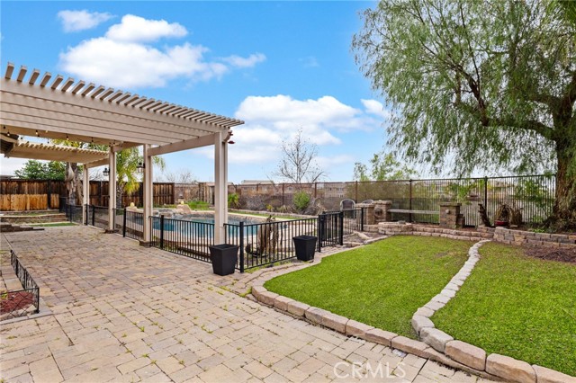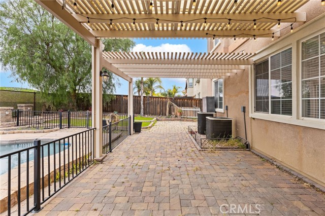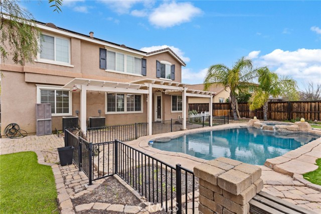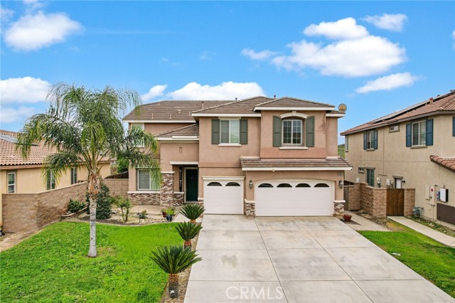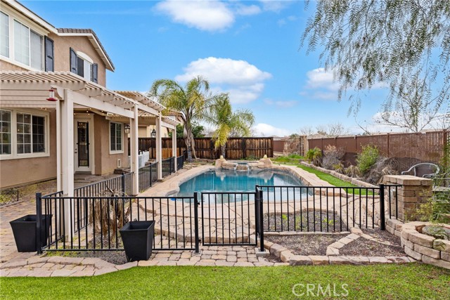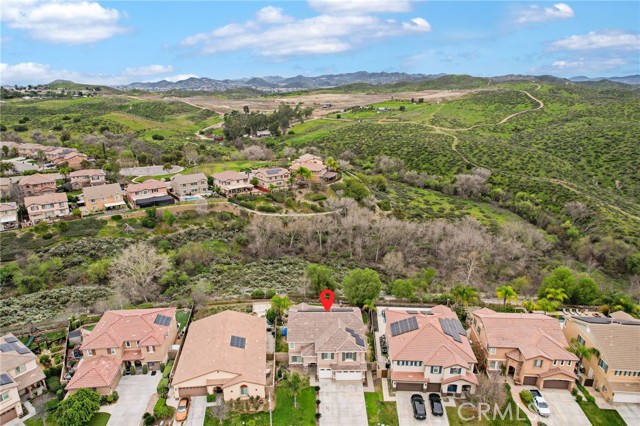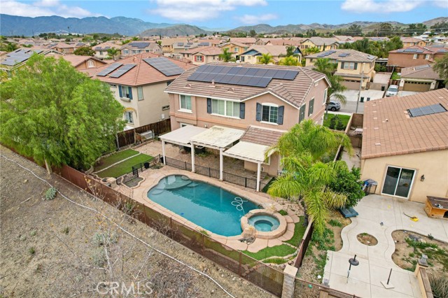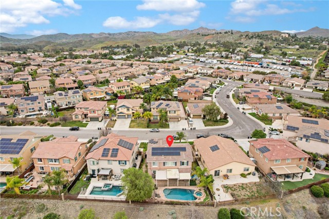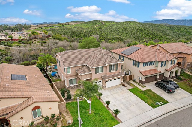 Stunning pool home located in the highly desirable Rosetta Canyon community, offering 4 bedrooms plus a den and 3 full bathrooms. Ideally situated just minutes from shopping, dining, Lake Elsinore, and the 15 Freeway. Upon entry, you’re welcomed by a formal dining area with tile flooring that flows into a spacious open-concept layout, perfect for both everyday living and entertaining. The kitchen features tile countertops, abundant cabinetry with under-cabinet lighting, recessed lighting, a large walk-in pantry with a custom door, and a custom island with rustic accents. The living room showcases soaring ceilings, laminate flooring, and a cozy fireplace. The main level includes a den with recessed lighting, easily convertible to a fifth bedroom, and a full bathroom with a shower. Upstairs, the expansive primary suite features laminate flooring and a fireplace. The en-suite bathroom offers a separate soaking tub and glass-enclosed shower, dual-sink vanity, private water closet, and two closets. Three additional bedrooms are generously sized and finished with laminate flooring. The backyard is a true private retreat, featuring a covered patio, custom saltwater pool and spa with security gate, and a tiered astro-turfed area anchored by a mature California Pepper tree. Enjoy sweeping valley views with no rear neighbors. Low HOA dues provide access to outstanding community amenities, including sports fields, basketball, baseball, football, and tennis courts, a dog park, and children’s playground.