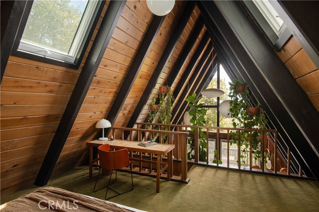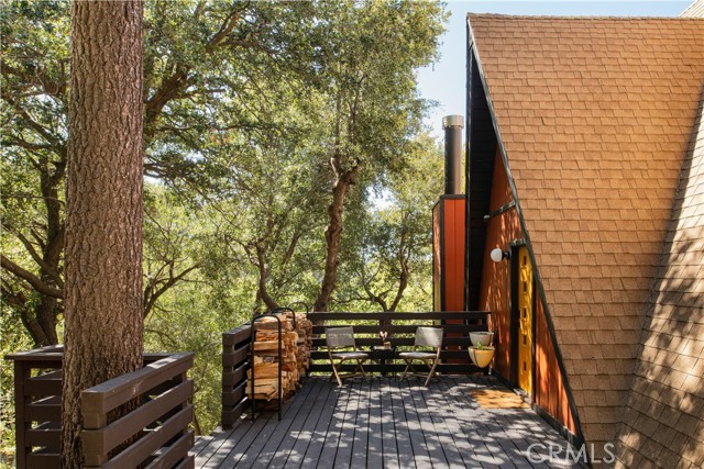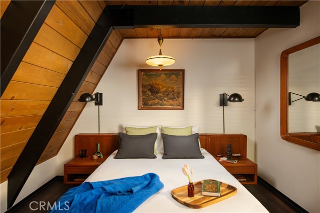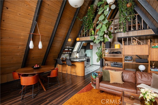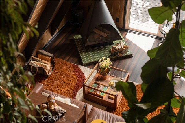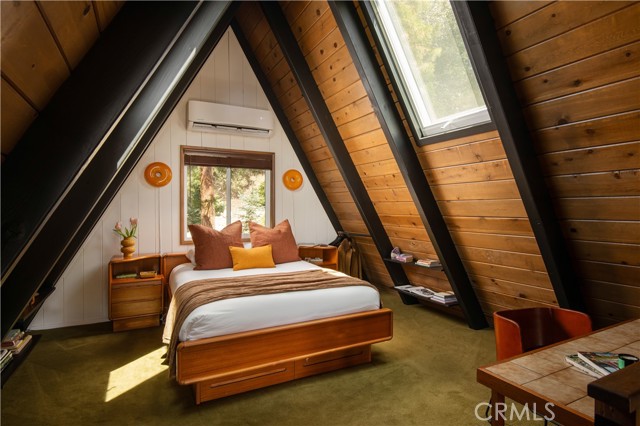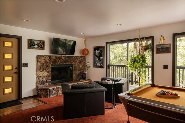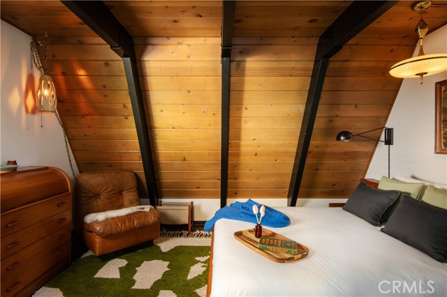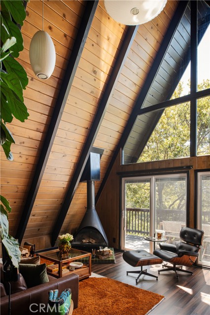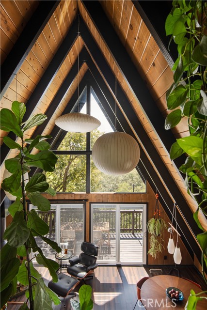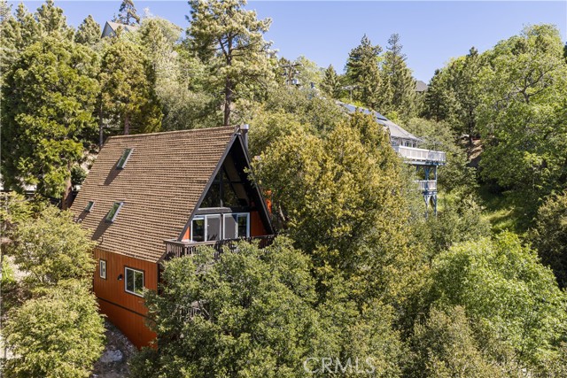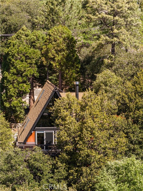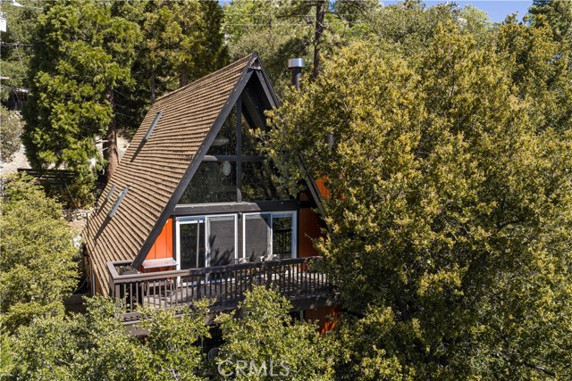 A true 1970s double A-frame, kept to its original intended design and set facing open views of expansive forest ridgeline and amenities nearby. Bold architectural lines and floor-to-ceiling windows create a seamless connection to the surrounding landscape. A dramatic wall of windows anchors the main living space, where an iconic Malm wood-burning fireplace serves as both a focal point and design statement. The interiors remain true to the era, with vintage-inspired tile, period lighting, and a cohesive material palette that feels both intentional and unique. A refined, design-forward spa-like bath enhances the home’s elevated aesthetic, while the upgraded kitchen—featuring a skylight—invites natural light and adds a fresh, modern contrast to the vintage character. The home offers 2 bedrooms and 2 bathrooms, along with an expansive lower level designed for gathering. This bonus space functions as a game and pool room, complete with its own fireplace, laundry, and direct access to a private deck and jacuzzi, set quietly among mature oak and pine trees. Above, the lofted bedroom is a standout—framed by two skylights and offering breathtaking views, natural light throughout the day, and a sense of openness that defines the upper level. A mini-split system provides efficient heating and cooling. Outdoor living begins with a large front deck leading to the entry, complemented by landscaped grounds on drip irrigation, a storage shed, easy access, and ample parking. A backup generator adds an extra layer of practicality and peace of mind. Located near Lake Arrowhead Country Club, with Lake rights and access to Lake Arrowhead amenities, the property is further distinguished by its setting—backing to the national forest and near Tunnel 2 Trail, offering a rare sense of privacy surrounded by nature. Lovingly maintained by full-time owners, the property has also gained recognition as a successful short-term rental and a sought-after setting for brand and editorial photoshoots—drawn to its distinct architecture and atmosphere. A rare offering where mid-century design, mountain living, and timeless character come together in one cohesive retreat.
